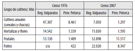 El siguiente cuadro presenta la variación de los principales grupos de cultivos en la Región de Valparaíso y su Provincia de Petorca de acuerdo a los censos agropecuarios, en 1976 y 2007. No existe otro censo de estas características después de 2007.