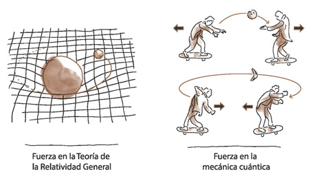 Dos maneras de entender las Fuerzas en la fisica moderna. La Fuerza gravitacional en terminos de geometría del espacio-tiempo (izquierda), las interacciones electromagnética, débil y fuerte como el intercambio de partículas mediadoras (derecha). Estas tres pueden ser atractivas o repulsivas y son descritas por la mecánica cuántica.