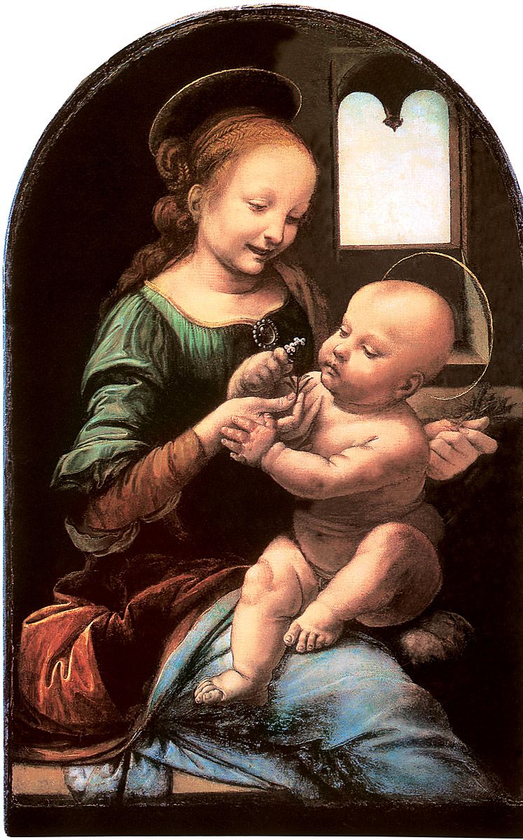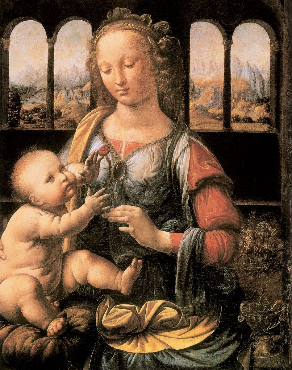 Virgen con una flor (La Virgen Benois), 1475-1478. Óleo sobre tela transferido sobre madera, 49,5 x 33 cm. Museo del Hermitage, San Petersburgo.