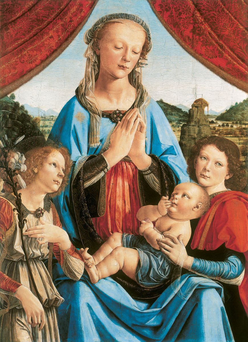 Leonardo da Vinci y Andrea del Verrocchio, La Virgen con el Niño y ángeles, c. 1470. Témpera sobre panel de madera, 96,5 x 70,5 cm. National Gallery, Londres.
