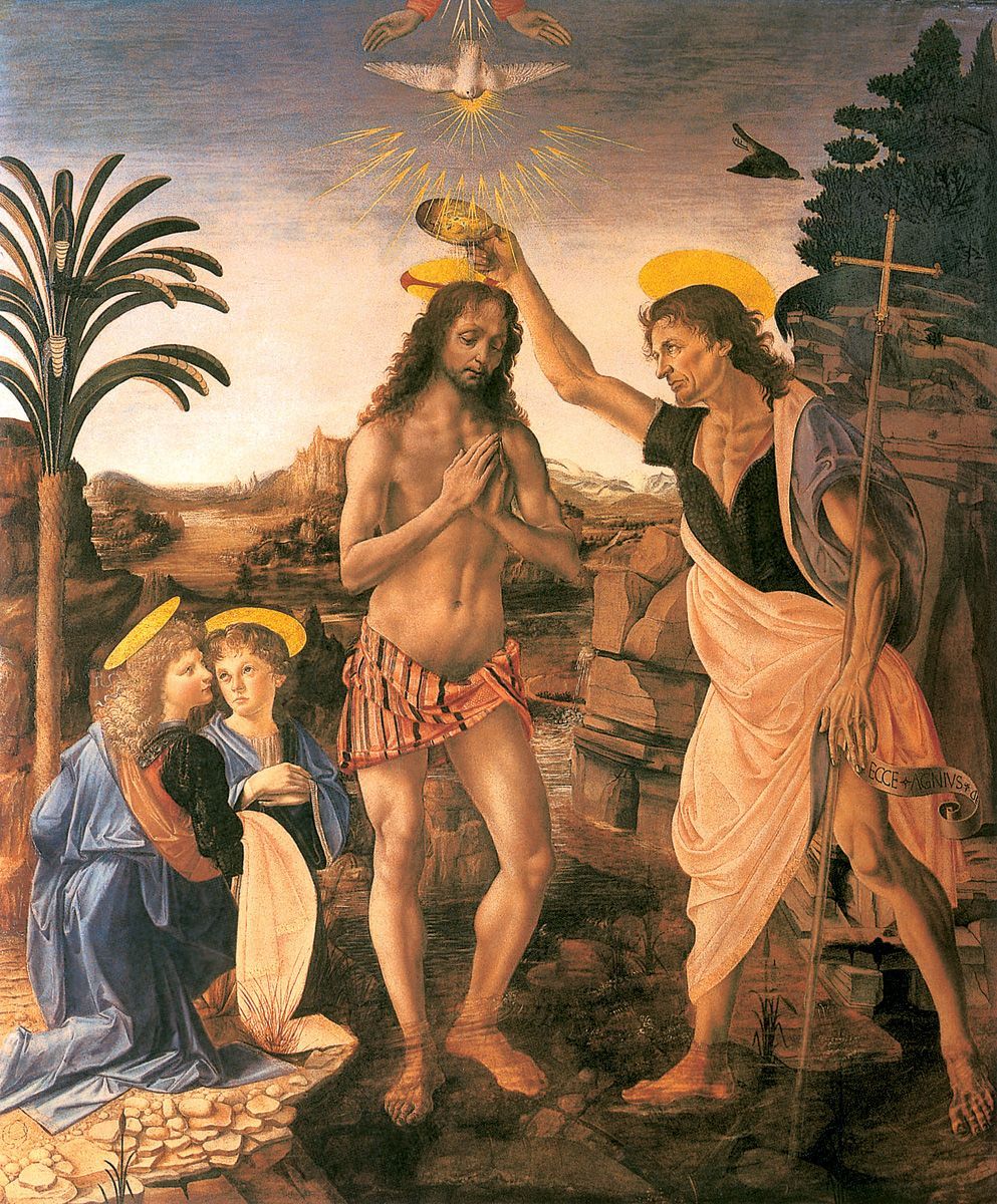 Leonardo da Vinci y Andrea del Verrocchio, El Bautismo de Cristo, 1470-1476. Óleo y témpera sobre panel de madera, 177 x 151 cm. Galleria degli Uffizi, Florencia.