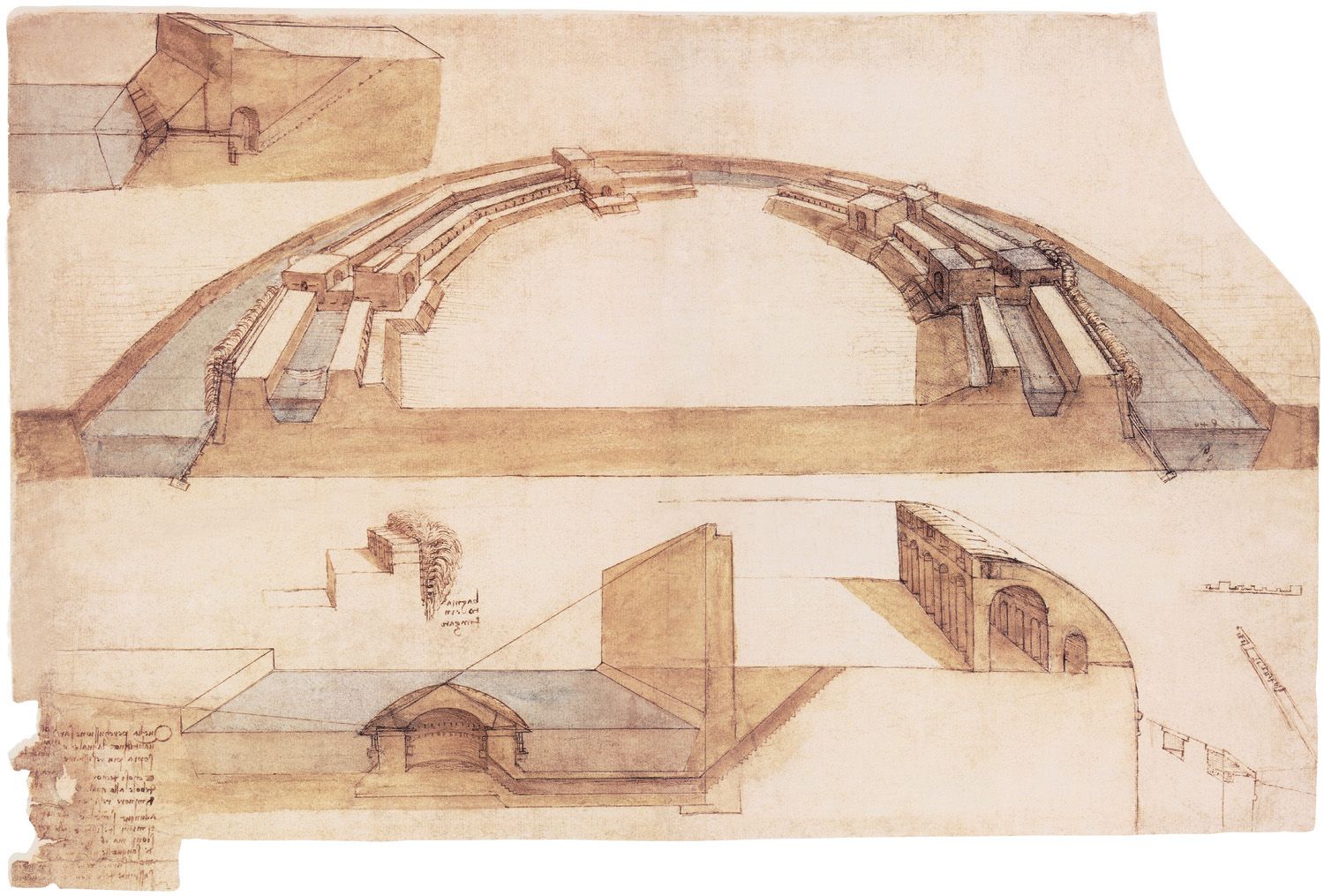 Estudio para un mecanismo fortificado con dos espacios, 1504-1508. Pluma y tinta, aguada, 44 x 29 cm. Biblioteca Ambrosiana, Milán.