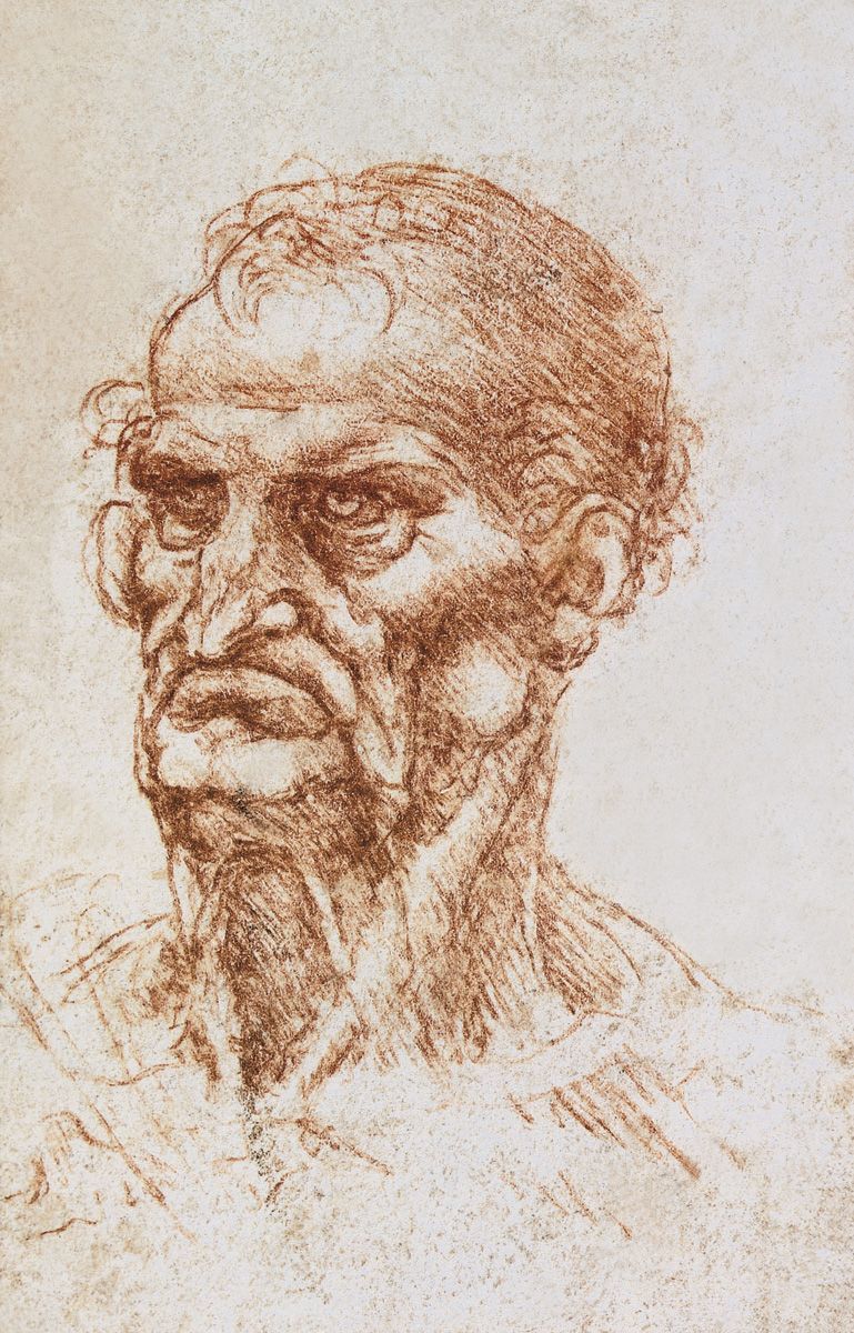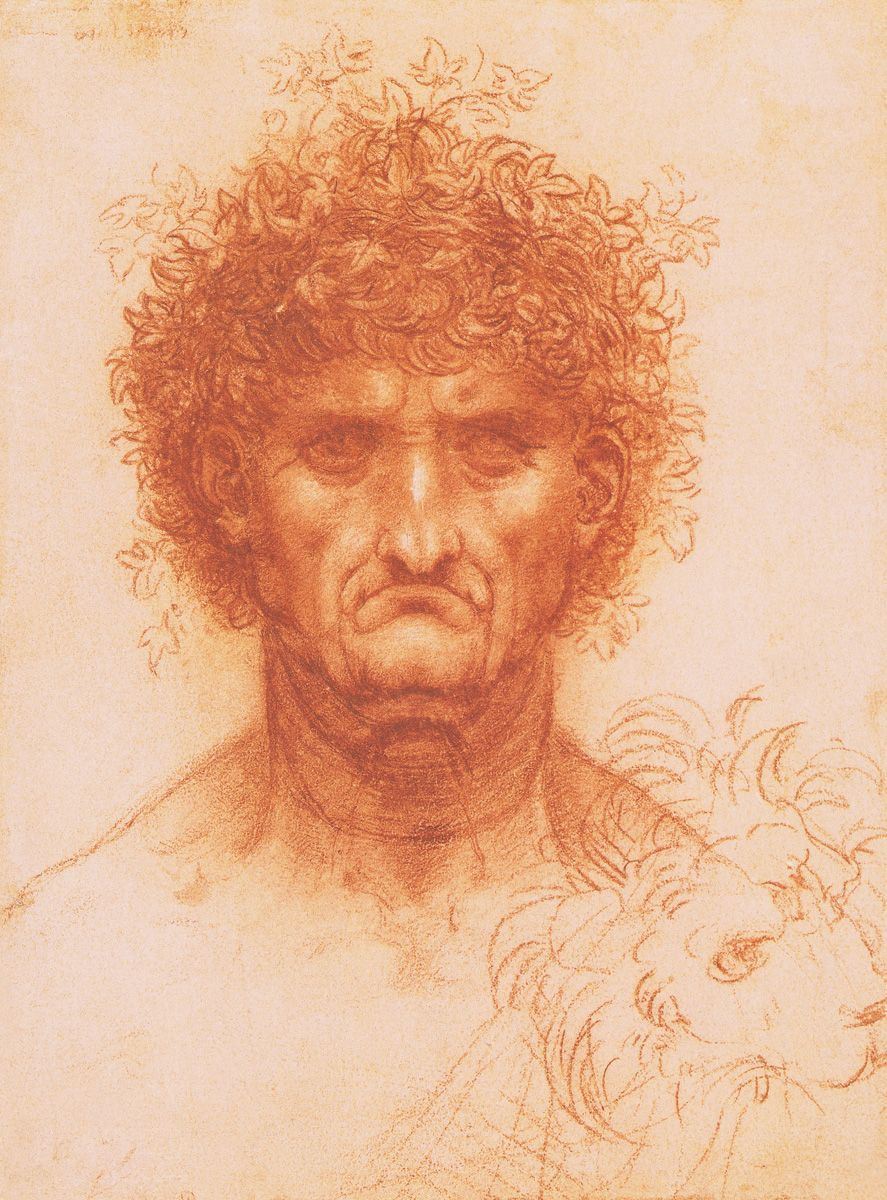 Busto de un hombre, cara completa, y cabeza de un león, c. 1505-1510. Tiza roja y reflejos blancos en papel, 18,3 x 13,6 cm. Biblioteca Real, Windsor Castle.
