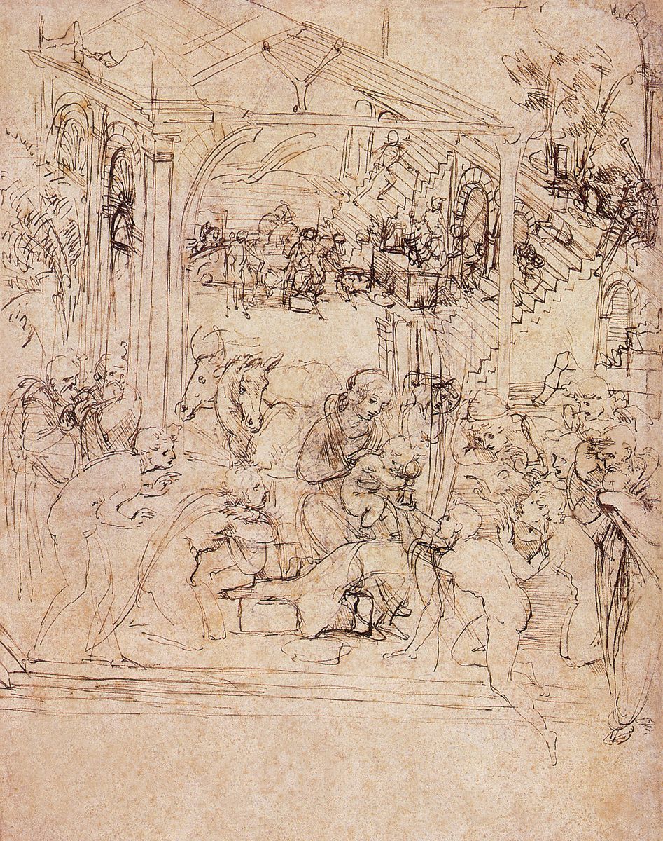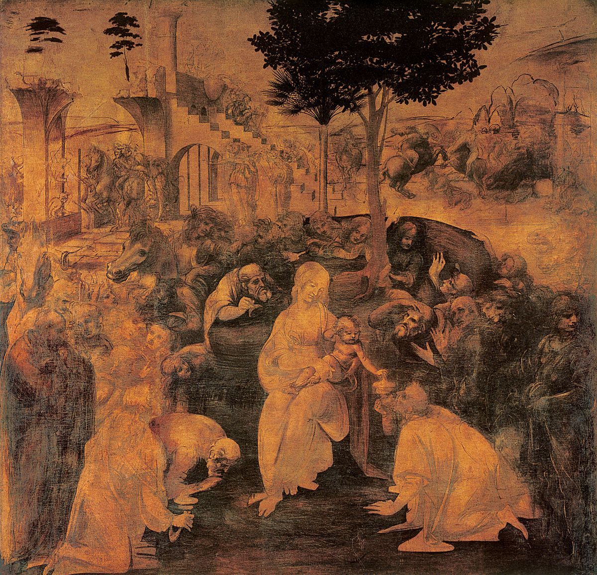 Un historiador del arte de los más autorizados ha analizado muy bien la técnica del cuadro de la Adoración: Leonardo -nos dice- dibujaba primero bastante claramente, con la pluma o el pincel, sobre el panel preparado; lo situaba todo en perspectiva, como lo prueba el dibujo del Museo de los Uffizi; luego sombreaba con un color oscuro; pero como se servía de una especie de betún, el tono se ha vuelto muy intenso y en las obras que ha terminado ese color bituminoso ha absorbido a los demás y ha ennegrecido las sombras más allá de lo conveniente.