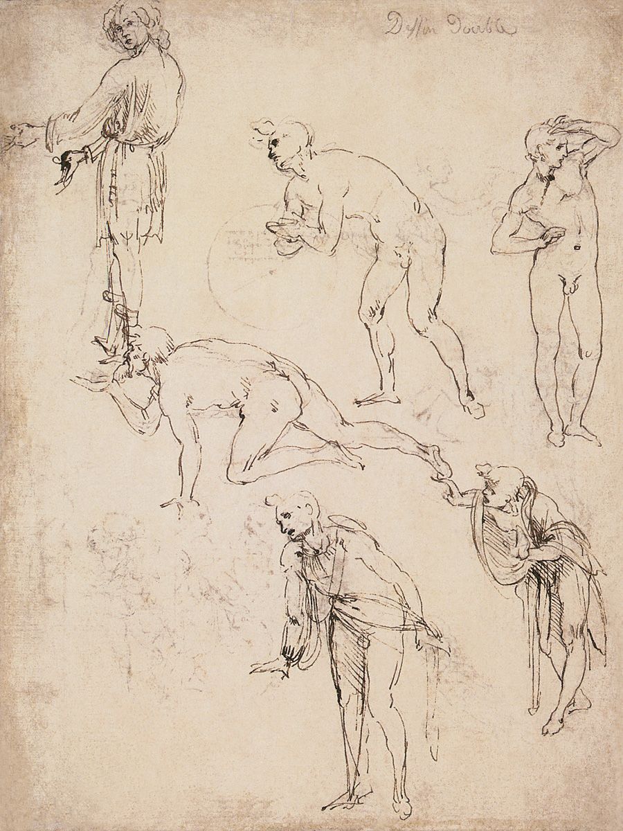 Seis estudios de hombres desnudos o con ropajes, c. 1480. Pluma y tinta, 27,7 x 21 cm. Musée du Louvre, París.