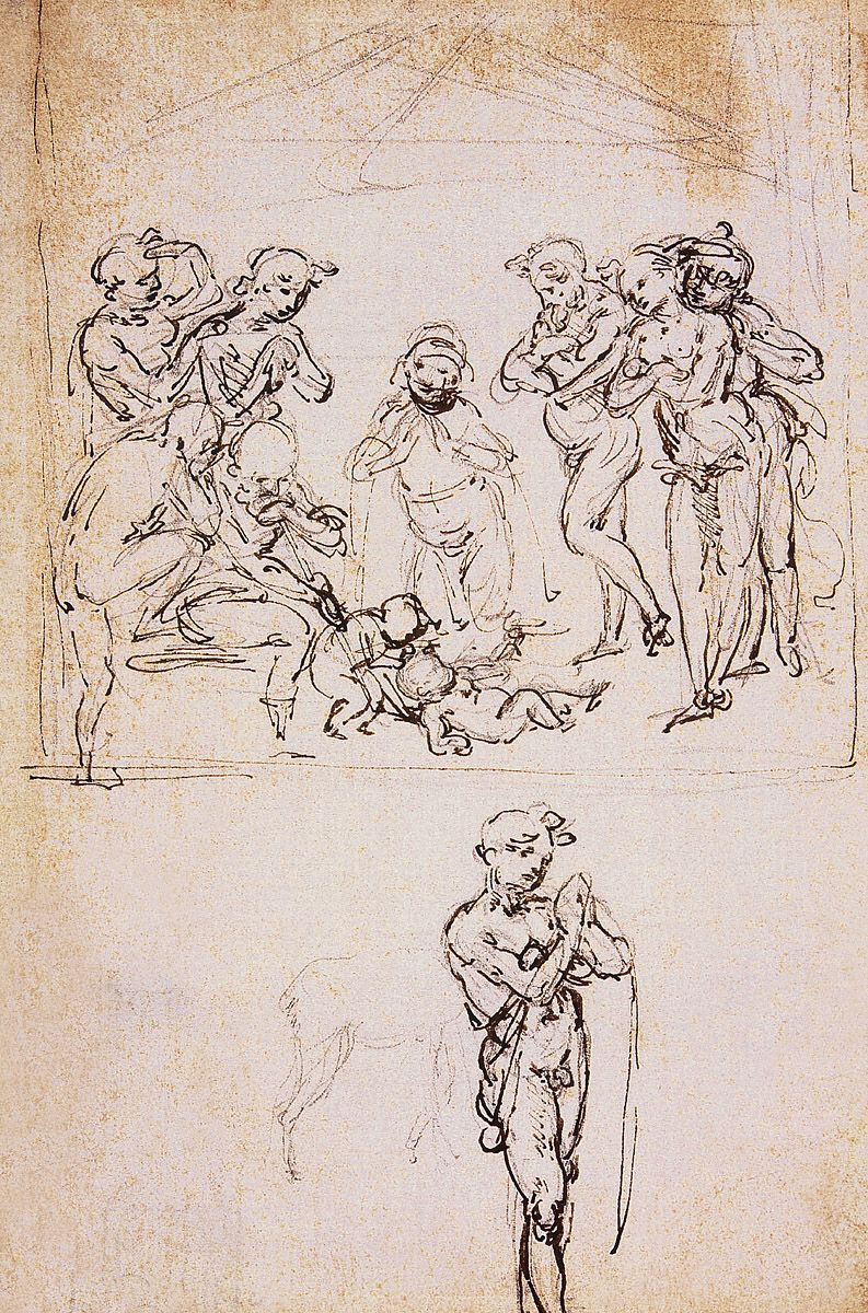 Estudios para La Adoración de los Magos, c. 1481. Pluma y tinta, punzón de metal sobre papel, 21,3 x 15,2 cm. Musée Bonnat, Bayona.