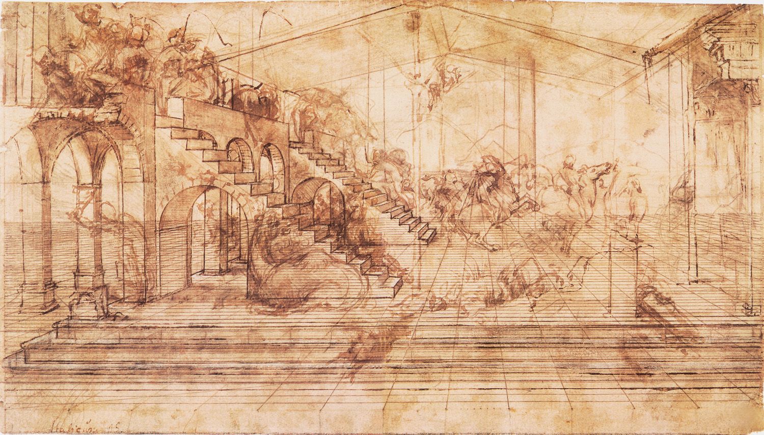 Estudio de perspectiva para La Adoración de los Magos, 1481-1482. Pluma y tinta, restos de punzón de plata y blanco sobre papel, 16,3 x 29 cm. Galleria degli Uffizi, Florencia.