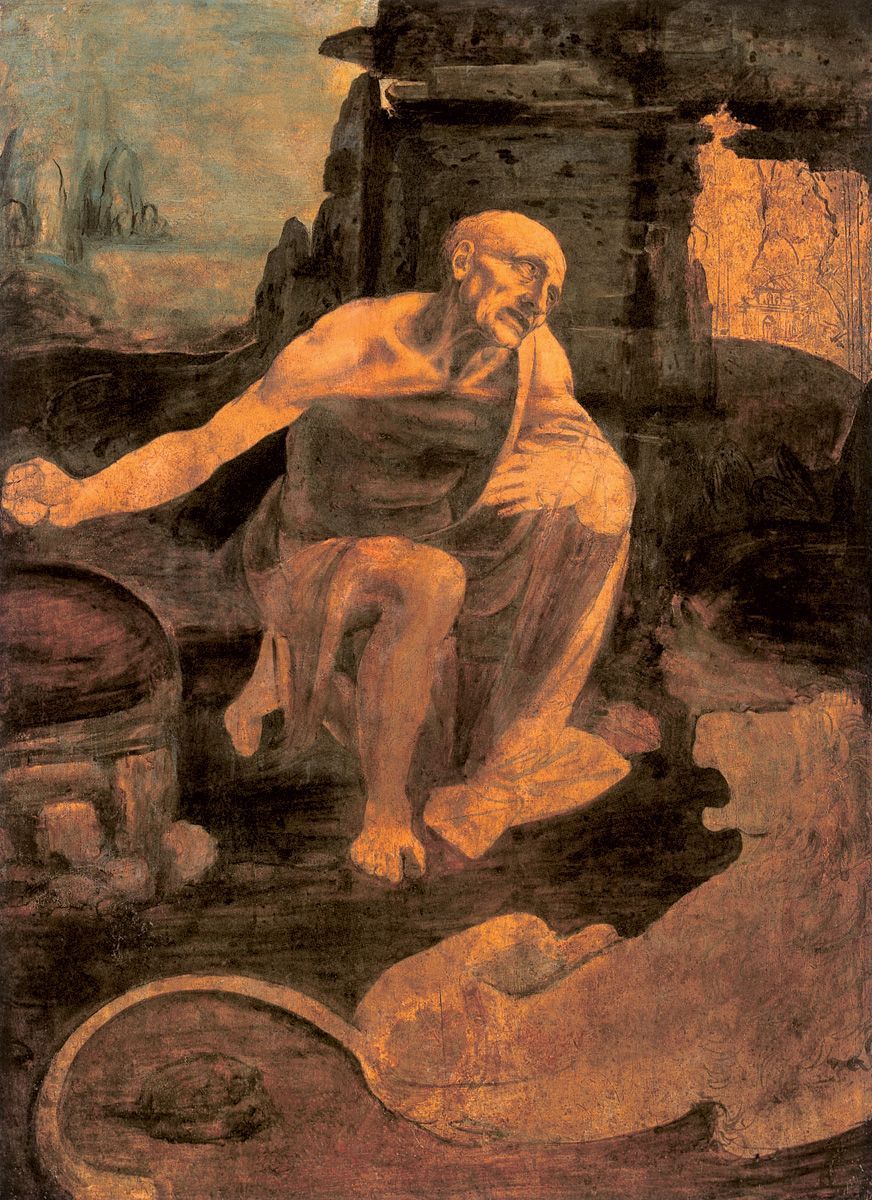 Se clasifica ordinariamente entre las producciones del período florentino el estudio para el San Jerónimo conservado en Windsor, y el esbozo del San Jerónimo, pintura sobre panel, expuesto en la Pinacoteca del Vaticano (antigua colección del cardenal Fesch). El estudio tiene tanta firmeza (el santo es representado de rodillas, con el crucifijo en una mano y la otra extendida para darse golpes de pecho) como indecisión y esfumamiento el esbozo. Las pruebas por las cuales ha pasado y su estado de degradación explican mucho sus imperfecciones (la cabeza, cortada en el panel, ha estado largo tiempo separada del resto de la composición). El santo es presentado con una rodilla en tierra, de cara al espectador; una mano retiene los pliegues de su indumentaria, extiende la otra para golpearse el pecho. Sus rasgos expresan un dolor profundo. Cerca de él, el león tradicional, de una conformación soberbia. En el fondo, la iglesia, en la que se quiere reconocer la de Santa María Novella de Florencia, con su fachada retocada por L. B. Alberti.