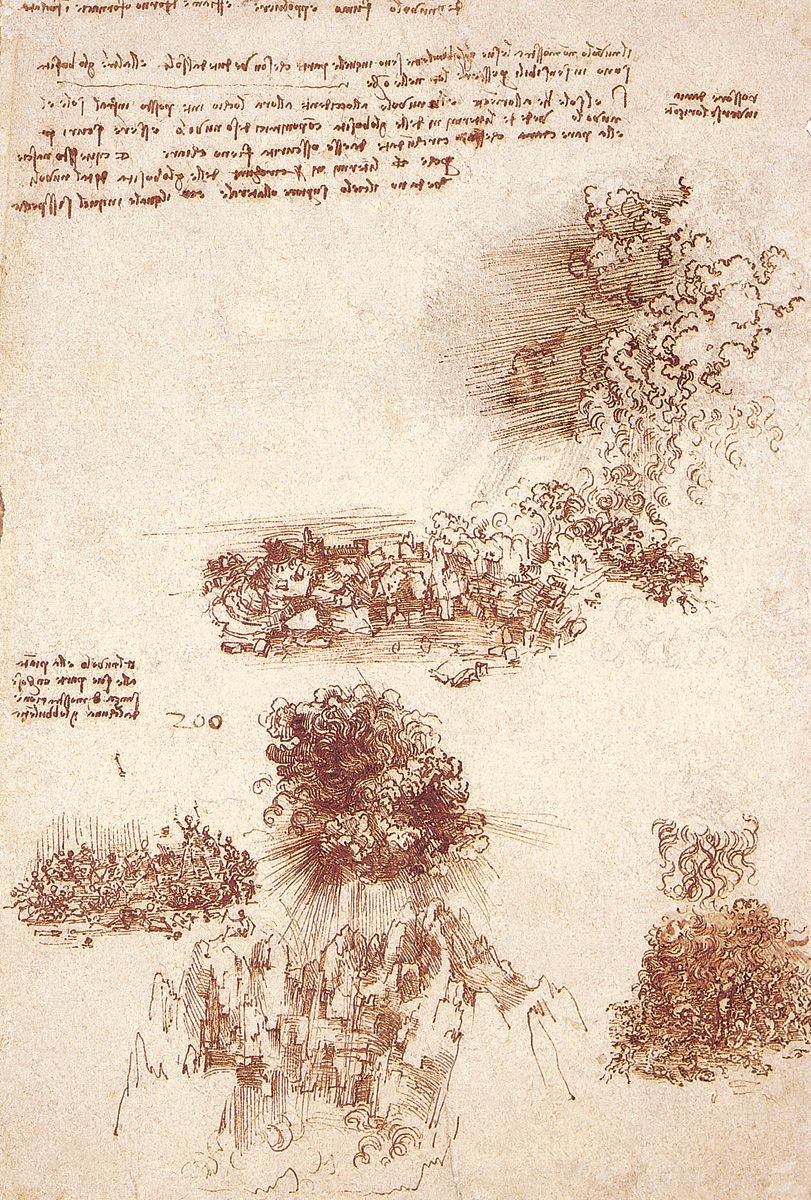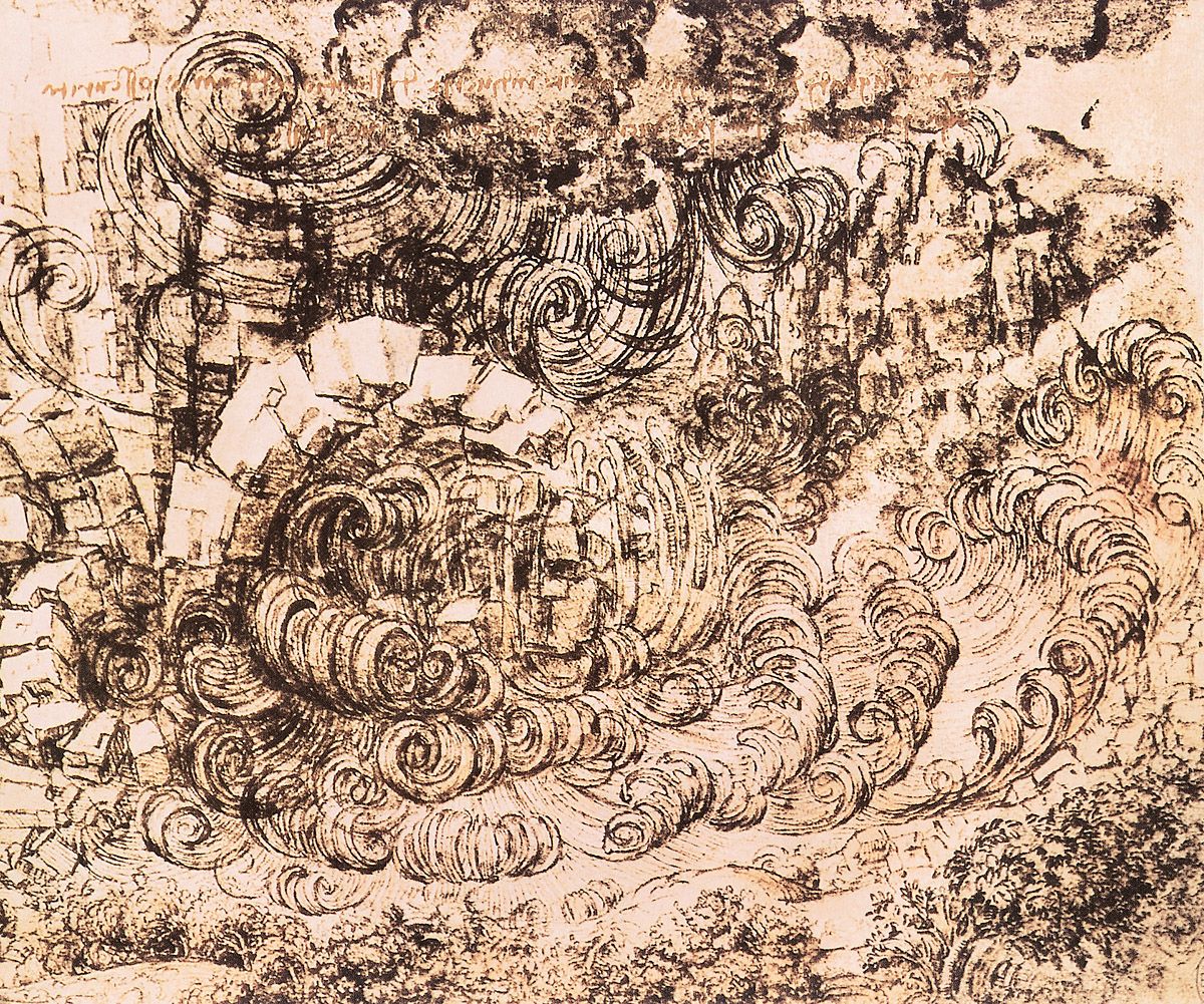Estudio cataclísmico, c. 1511-1512. Carboncillo o tiza negra suave, retrabajado con pluma y tinta dorada y marrón oscuro, 30 x 20,3 cm. Biblioteca Real, Windsor Castle.