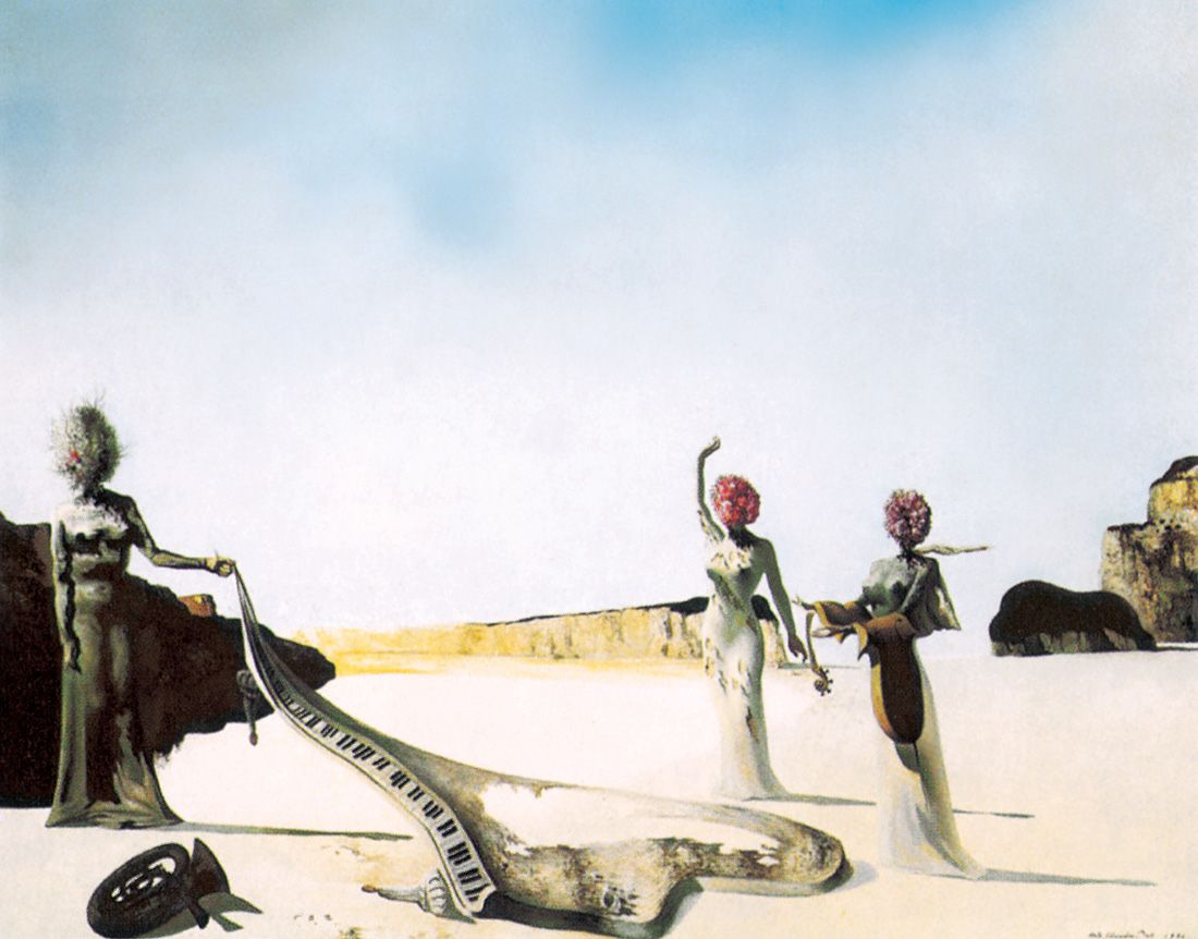 Tres jóvenes mujeres surrealistas que sostienen en sus brazos las pieles de una orquesta, 1936. Óleo sobre lienzo, 53 x 65 cm. The Salvador Dalí Museum, San Petersburgo (Florida).