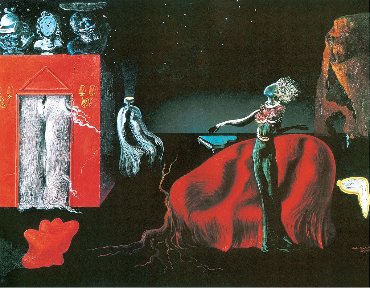 Mi mujer, desnuda, contemplando su propio cuerpo convirtiéndose en escalera, tres vértebras de una columna, cielo y arquitectura, 1945. Óleo sobre tabla, 61 x 52 cm. Colección privada.