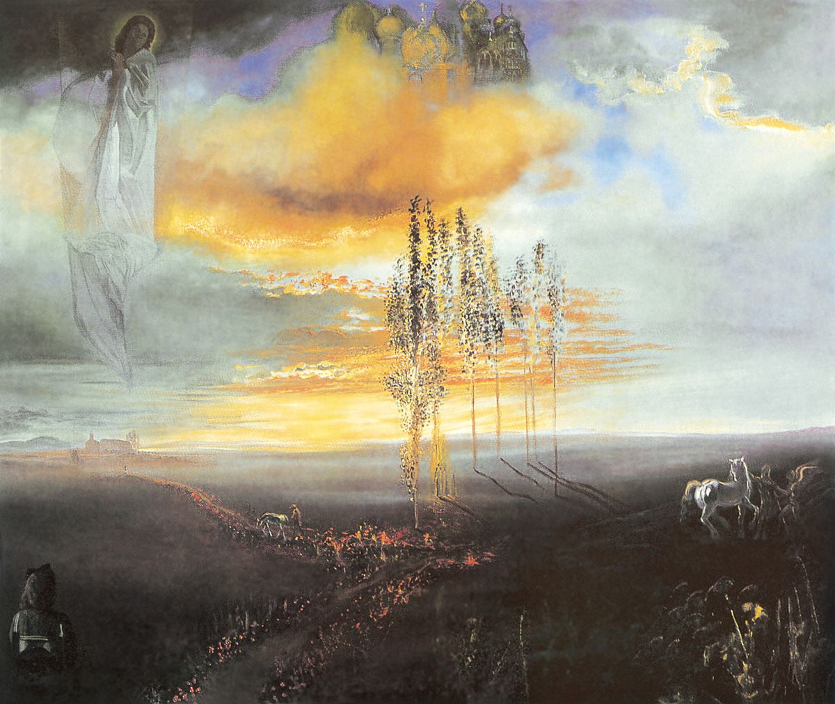 «La explosión de la bomba atómica el 6 de agosto de 1945, me sacudió de forma sísmica. Desde ese momento el átomo se convirtió en el primer objeto de mis cavilaciones. Varios paisajes que pinté en esa época expresan el enorme miedo que sentí al enterarme de la explosión. Apliqué mi método paranoico-crítico para explorar este mundo. Quería comprender los poderes latentes y las leyes de las cosas, a fin de dominarlas, y tuve la idea brillante de que yo era el guardián de un arma rara que permitiría avanzar al núcleo de la realidad: el misticismo, es decir, el profundo conocimiento intuitivo de lo que es la comunicación inmediata con la visión íntegra y absoluta de la misericordia de la verdad, la misericordia de Dios».