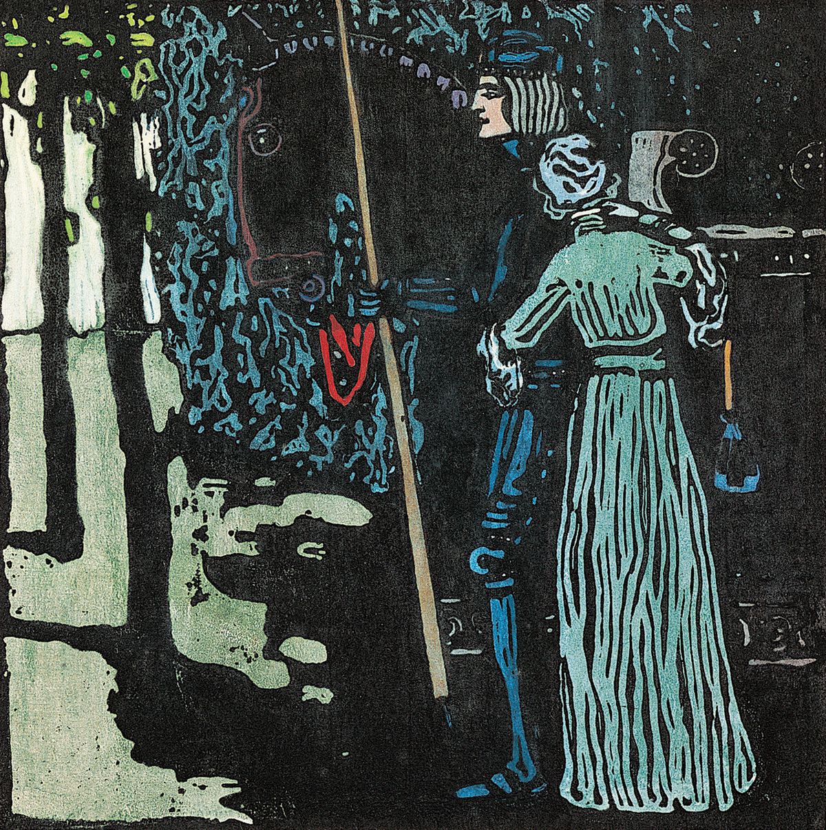 Afiche para la primera exposición de la escuela de arte La Falange, 1901. Litografía en color (posterior al dibujo de Kandinsky), 47,3 x 60,3 cm. Galería Municipal de Lenbachhaus, Munich.