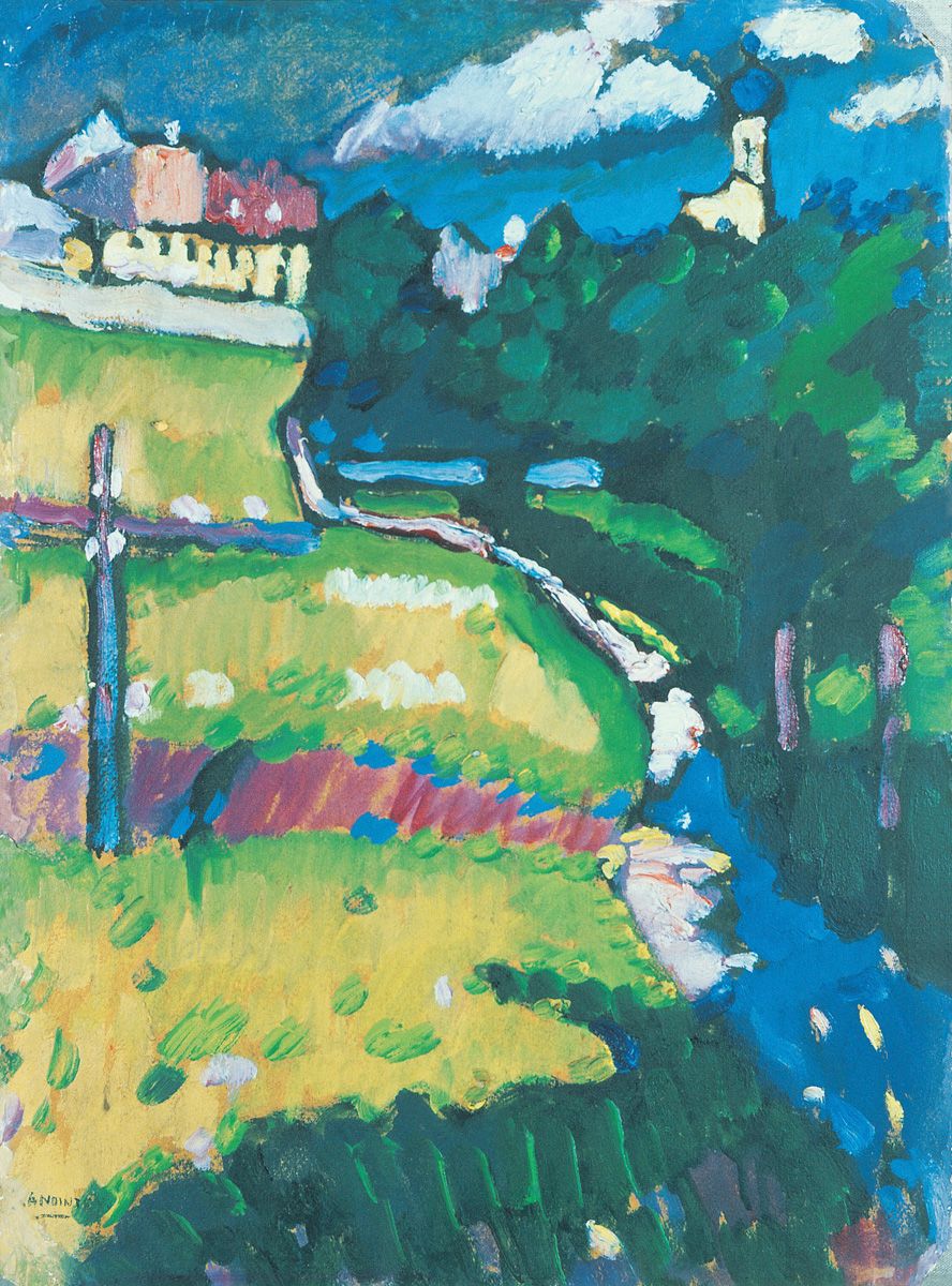 Iglesia en Murnau I, 1910. Óleo y acuarela sobre cartón, 64,9 x 50,2 cm. Galería Municipal de Lenbachhaus, Munich.