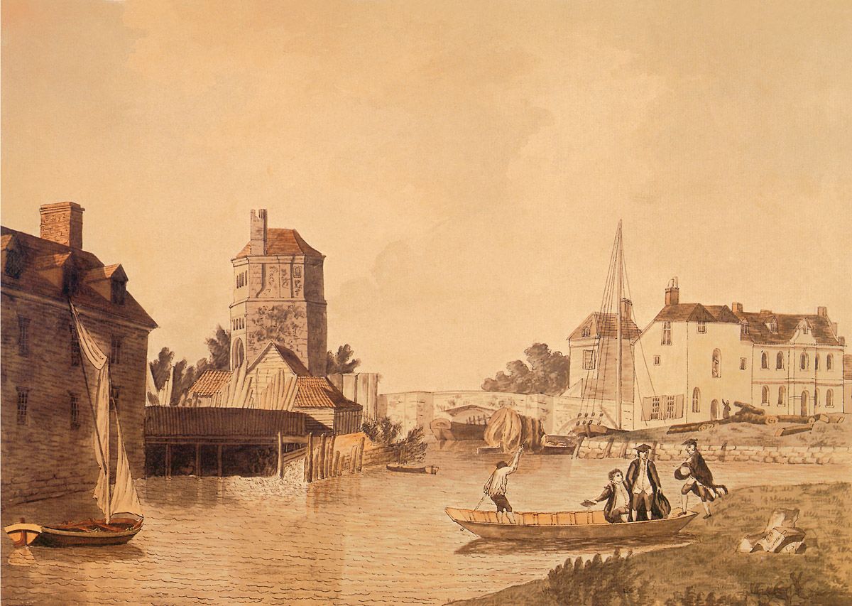 2. J.M.W. Turner, Puente Folly y Torre de Bacon, Oxford, 1787. Lápiz y tinta con acuarela, 30.8 x 43.2 cm. Legado de Turner, Galería Tate, Londres. La obra es la transcripción de una imagen realizada para el Oxford Almanack de Michael Angelo Rooker.