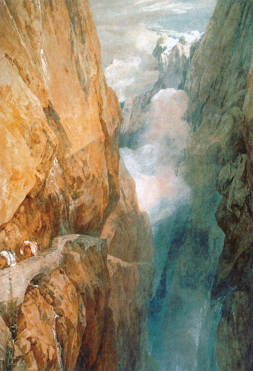 5. J.M.W. Turner, El paso del Monte San Gotardo, visto desde el centro de Teufels Broch (Puente del Diablo), Suiza, firmado y fechado 1804. Acuarela, 98.5 x 68.5 cm. Galería de Arte Abbot Hall, Kendal, Cumbria.