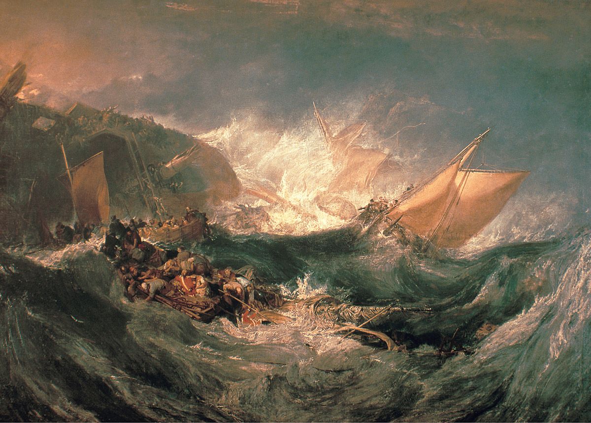 9. J.M.W. Turner, El naufragio de un buque de transporte, c. 1810, óleo sobre lienzo, 172.7 x 241.2 cm. Fundaçao Calouste Gulbenkian, Lisboa. Con este cuadro, Turner agotó su necesidad de expresarse mediante escenas de aterradores naufragios, pues, con una sola excepción, no volvió a pintar ese tema en los siguientes doce años.