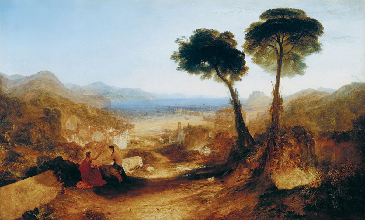 11. J.M.W. Turner, La bahía de Baia: Apolo y la sibila, RA 1823, óleo sobre lienzo, 145.5 x 239 cm. Legado Turner, Galería Tate, Londres. Este cuadro fue exhibido con la inscripción “Llévame a la asoleada costa de Baia”. El pintor George Jones, amigo de Turner, quien sabía que el paisaje real era mucho más prosaico de lo que aparecía aquí, escribió las palabras ‘SPLENDIDE MENDAX’ (mentiras espléndidas) en el marco. A Turner le encantó eso y declaró, “Todos los poetas son mentirosos”, una afirmación que comprueba la ecuación que para él existía entre pintura y poesía. Dejó la inscripción en el marco muchos años.