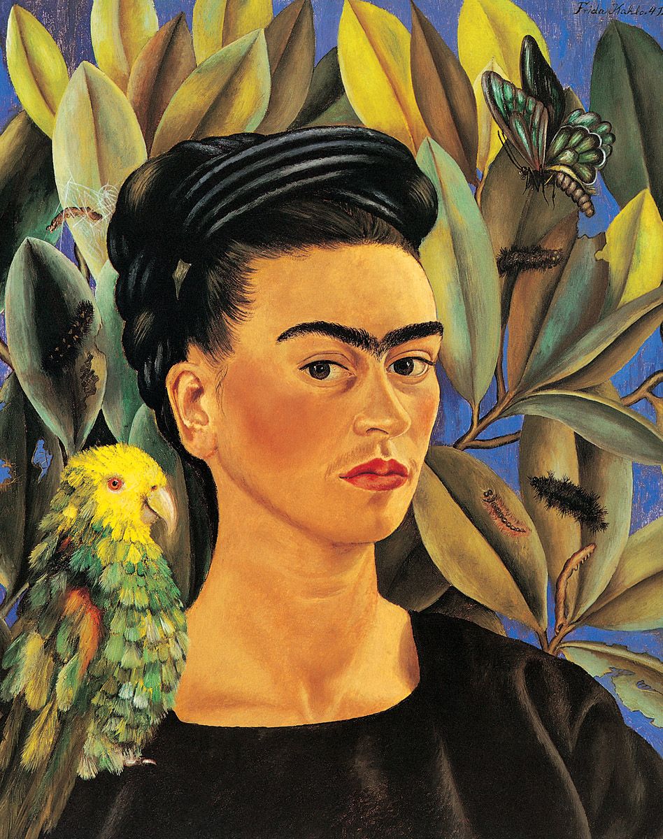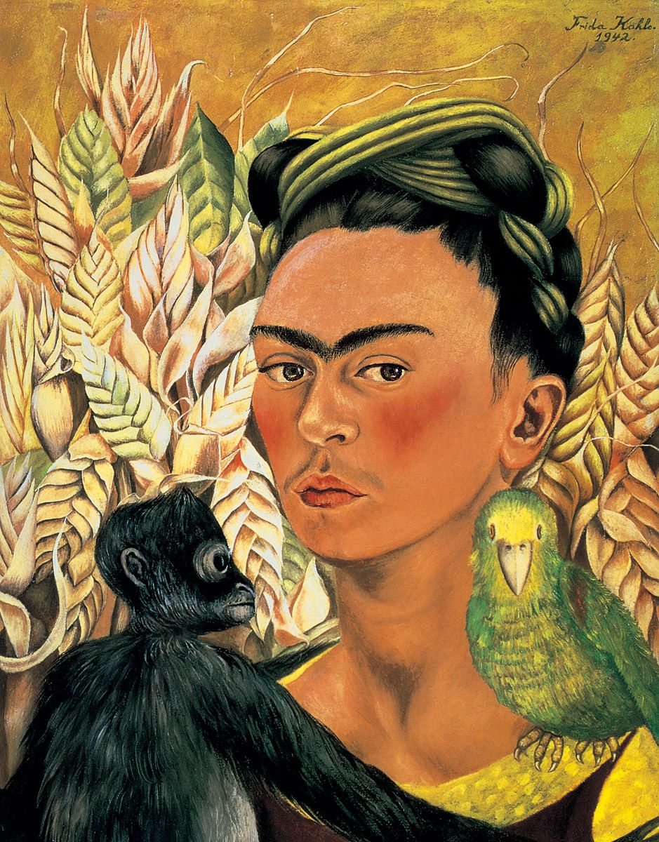 Frida Kahlo, Self-Portrait with Monkey and Parrot, 1942. Oil on masonite, 54.6 x 43.2 cm. Private collection.