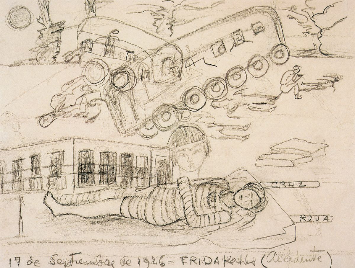 La escena del accidente ofrecía un espectáculo absolutamente dantesco. De alguna manera, el choque le arrancó las ropas y la arrojó desnuda al suelo destrozado del autobús. Junto a Frida se encontraba sentado un pintor o artesano que llevaba un paquete de oro en polvo. Éste se rompió, y su contenido cayó sobre el cuerpo desnudo de Frida. El pasamanos de hierro se clavó en sus caderas y salió por la pelvis. Su herida empezó a sangrar profusamente, y su sangre se mezcló con el oro en polvo. En medio del caos, los testigos del accidente, al ver aquel singular cuerpo dorado, perforado y bañado en sangre, empezaron a gritar: «¡La bailarina! ¡La bailarina!». Uno de los espectadores insistió en que era necesario sacar el pasamanos de su cuerpo. Se inclinó y lo arrancó de la herida. Ella dio un grito tan fuerte que no fue posible oír la sirena de la ambulancia que se acercaba al lugar del accidente.
