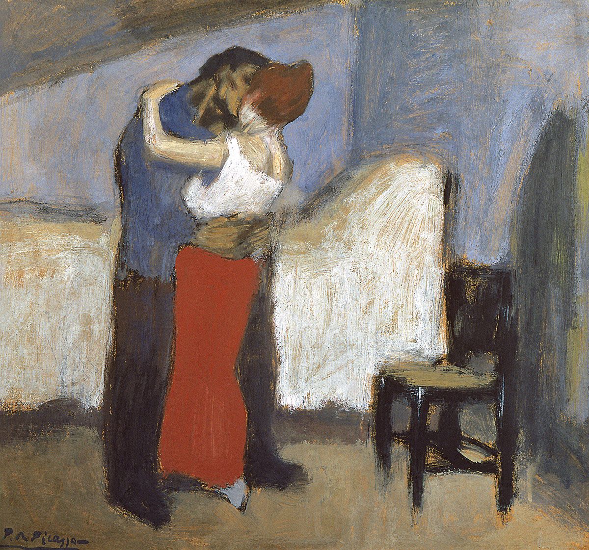 In that same autumn of 1900, in Paris, the artist produced three other versions of the same motif: two of them (which clearly preceded the third) entitled Lovers in the Street, and the third called Brutal Embrace, which, whilst similar in composition and staffage, is antithetical to the Moscow picture in the shocking vulgarity of the subject, the number of genre details, and the sarcastic mood. Picasso’s artistic expression was direct in character, and whatever his means, his works always corresponded exactly to his intentions.