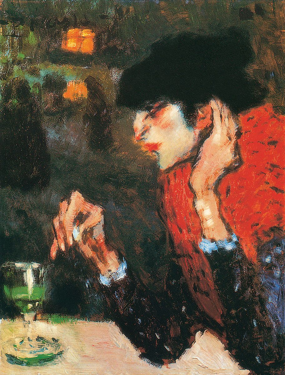 Baudelaire, Verlaine, Rimbaud, Gauguin, Van Gogh, Toulouse-Lautrec were all maudit, it was something inseparable from bohemian life and alcohol. As early as this painting, Picasso hit upon the idea of alcohol, first as a means of replacing the banality of the everyday environment with a different, internal, spiritual one; second, as a parallel, in its burning quality, to the maudit artists’ art and poetry (Apollinaire, who had a spiritual bond with Picasso, called his first volume of poems, Alcools, published in 1913); third, as an elixir of wisdom, but also of mortal melancholy.