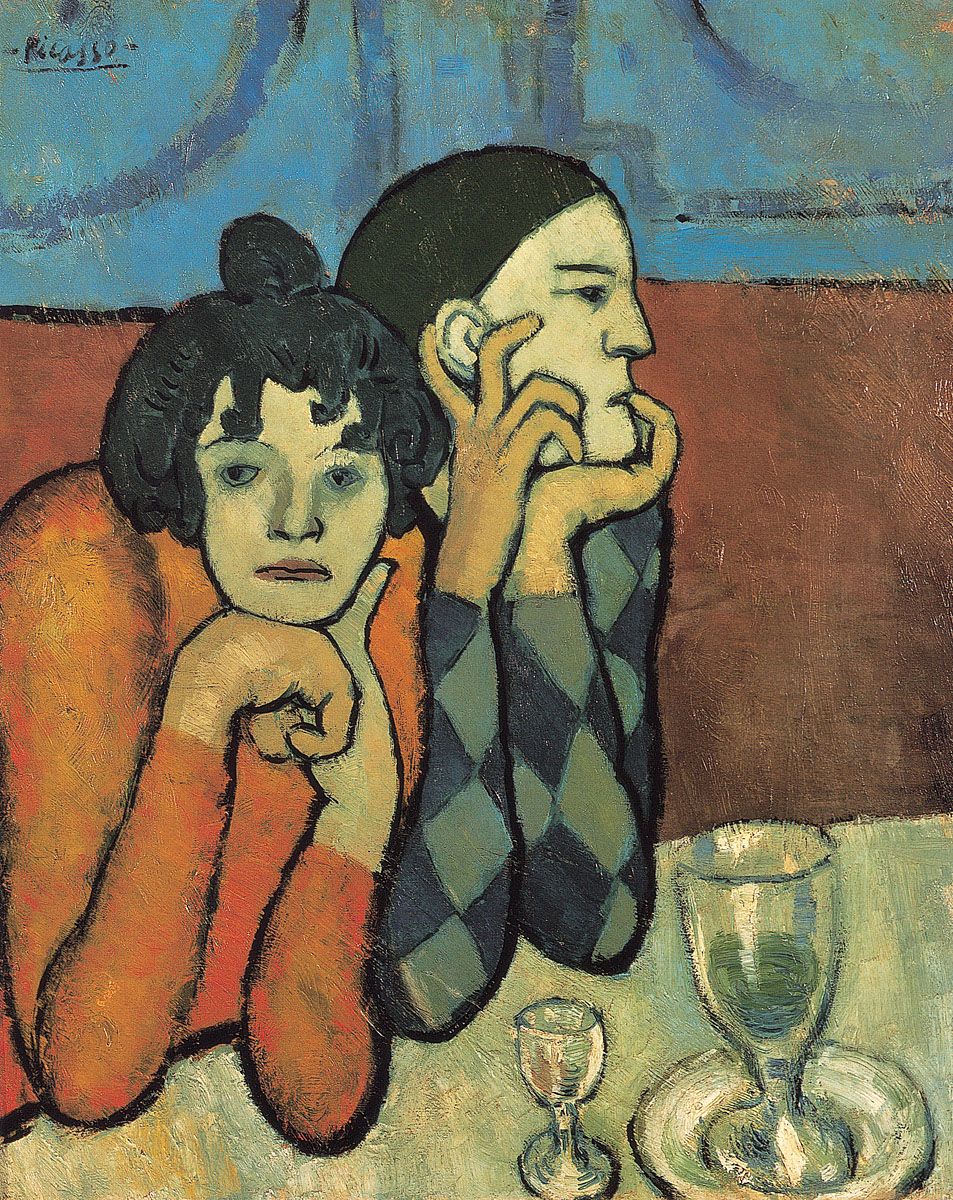 Instead of responding to life with spontaneous and sharpened, Fauve-like colours, he now painted somewhat-abstract picturesque allegories with poetic and symbolic details and a compositional structure based on colour and rhythm. Here we find two canvasses dating from this period, the autumn of 1901, Harlequin and His Companion (The Saltimbanque) and The Absinthe Drinker.