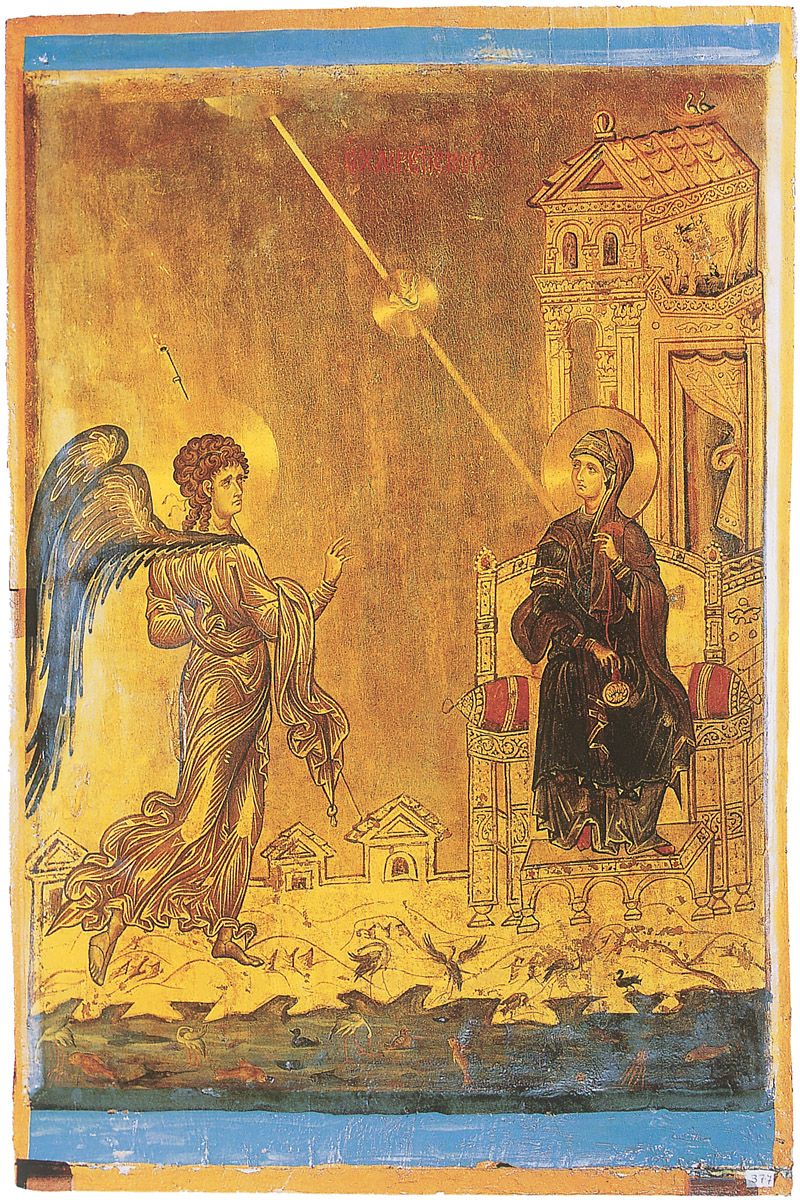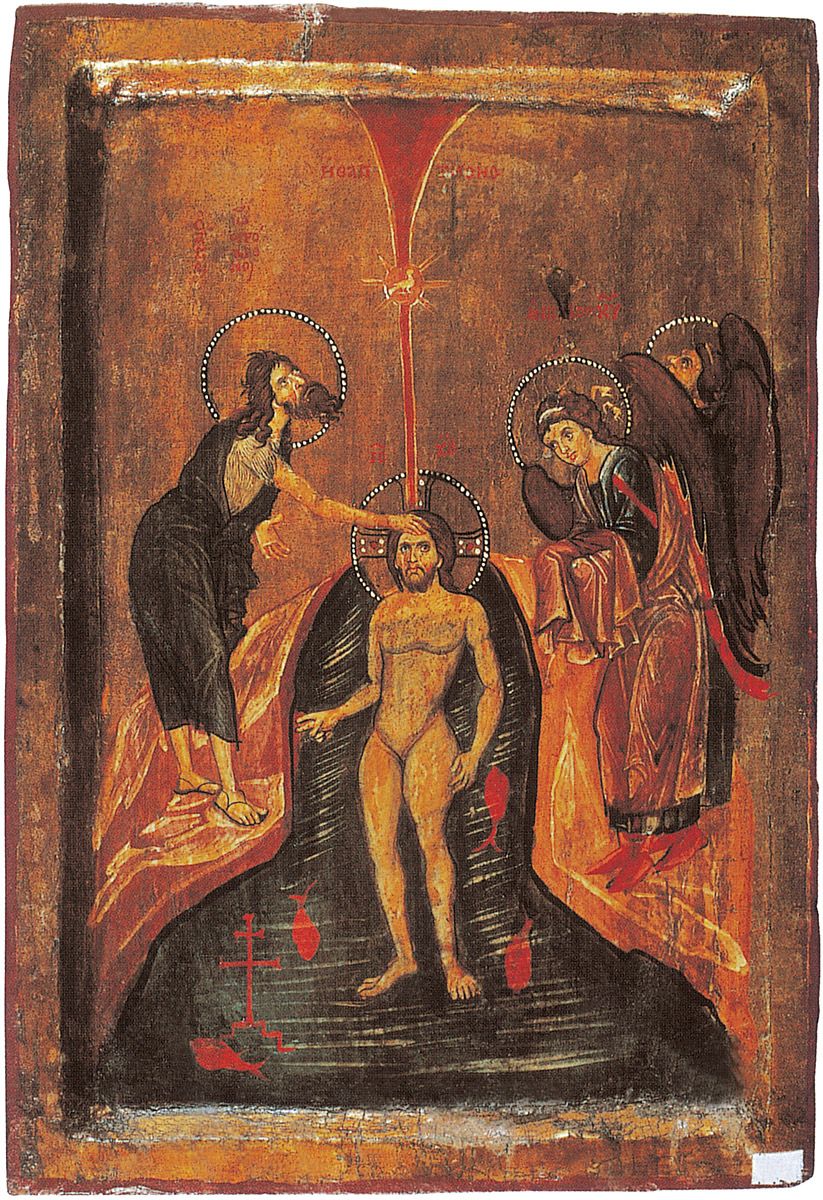 La escena de la Natividad da un recuerdo similar de la gruta de Belén, aun abierta y accesible a los peregrinos, tal y como fuera antes de que Constantino construyera su gran iglesia encima. La gruta es un nicho bajo excavado en la roca, encima está la estrella, adentro el pesebre con el Niño y al lado izquierdo de la entrada María yace sobre un colchón, mientras que al lado derecho José aparece sentado y soñoliento. En el Bautismo, Jesús es representado como un niño de pie con el agua hasta el cuello. Juan pone su mano sobre Él, dos discípulos se paran atrás, del lado derecho dos ángeles ofrecen toallas y en la parte alta la mano de Dios envía la paloma. Esta es una muy vieja composición, como lo son también la Ascensión y la Crucifixión, con los dos ladrones y la figura de Cristo vestida con un traje púrpura. Composiciones que se remontan a los siglos IV y V.