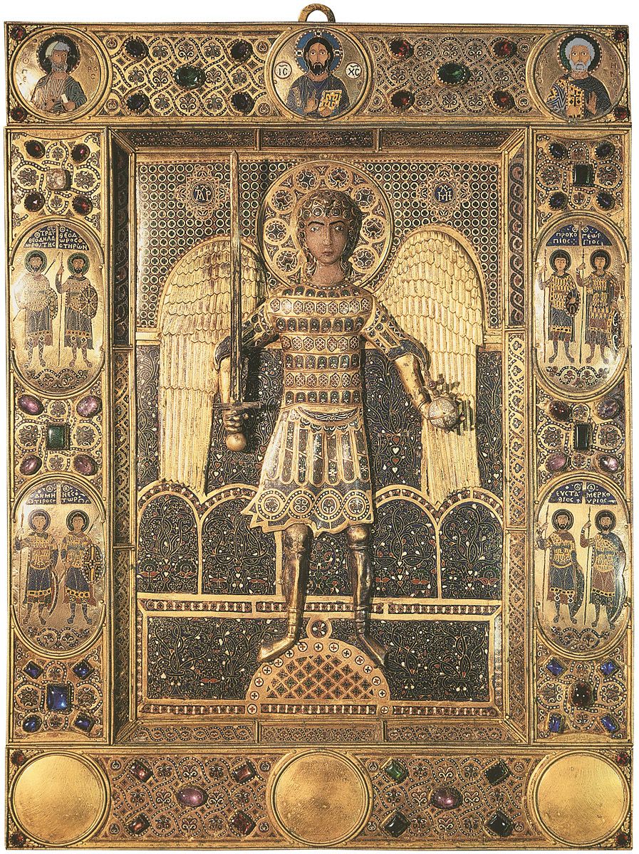 Fue por un raro golpe de suerte que se conservaron en Novgorod algunos íconos bizantinos: uno de San Pedro y San Pablo en la catedral de Santa Sofía; dos de la Anunciación, uno en el monasterio de San Antonio en Roma y otro en la iglesia de San Boris y San Gleb; y uno de San Jorge en el monasterio del mismo nombre. Pero aun en Rusia gran número de íconos antiguos son griegos y no realmente bizantinos: se remontan a los siglos XIV y XV y fueron pintados en Grecia oriental. Hay algunos íconos bizantinos verdaderos en el Museo Ruso que han servido de fundamento al estudio del estilo de Bizancio[26]. Tal es el notable ícono de San Gregorio Taumaturgo del siglo XI inscrito con su nombre: con su estilo severo, es el perfecto sustituto para las representaciones de obispos en un mosaico calado en la catedral de Santa Sofía en Constantinopla. El impecable dibujo de la figura puede escasamente clasificarse como pintura, en vista de la palidez de los colores y de la leve indicación de relieve, pero la perfecta maestría con que los pliegues del manto traducen la gradación con sombras, los planos más brillantes, y los relieves de variar los tonos del castaño claro, recuerdan los mosaicos de la Capilla Palatina en Palermo. Pero, a diferencia de los mosaicos, encontramos en este caso un color brillante sobre las mejillas bronceadas y un vívido color carne, pese al rostro pálido. Este ícono es claramente un retrato real que por su tipo se asemeja a los íconos de San Gregorio en Santa Sofía de Kiev y su similar esmaltado de la Pala d’Oro en San Marcos en Venecia.