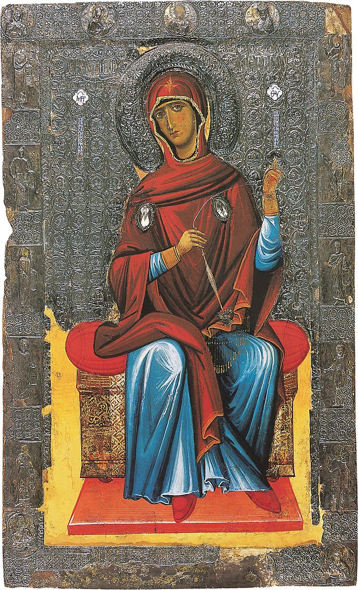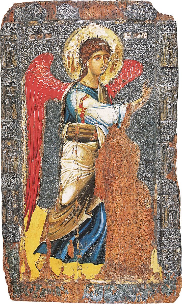 Es preciso pasar por alto varios íconos bizantinos pequeños, la mayoría provenientes del Monte Athos. Las dimensiones de los más grandes, todos bizantinos, excepto aquellos del siglo XV que fueron producidos en condiciones bien diferentes, pueden darnos una idea del rol jugado por los íconos en el arte de Bizancio. Es evidente que las iglesias bizantinas tenían sus llamados “íconos fijos”, pues estaban permanentemente fijados en los intercolumnios de los iconostasios y permanecían siempre en su sitio[29]. En las catedrales rusas estos íconos fijos alcanzaron grandes dimensiones, algunos con hasta dos metros de alto y de ancho. En Bizancio, dado que los iconostasios no tenían más de ocho o diez intercolumnios, los íconos fijos fueron más pequeños que los rusos. Es más difícil circunscribirse a los tamaños de los íconos devotos o domésticos: los de Nuestra Señora, generalmente de este tipo, no superaban los treinta centímetros de largo. Es notable que en todos los íconos griegos muy antiguos, aun en los más grandes, la superficie de la pintura luce hundida: fueron cincelados o, en el caso de los más grandes, se les aplicó una especie de marco. No así los íconos ítalo-cretenses y del sur de Italia. En los íconos rusos primitivos se encontraron esas mismas superficies hundidas, especialmente en los de Novgorod.