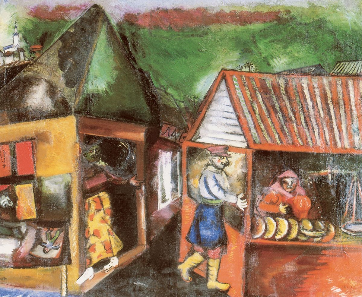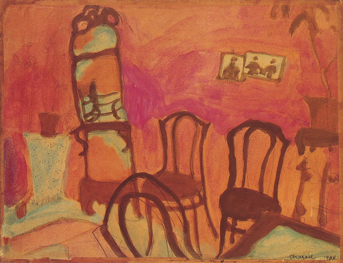 Fue por esta experiencia en la niñez que se originan las escenas pictóricas del vocabulario plástico de Chagall. Pero los fragmentos de la memoria que fácilmente identificamos en objetos concretos aún en los primeros trabajos, el salón, el reloj, la lámpara, el samovar, la mesa del Sabbath, la calle de la aldea, la casa en donde nació y su techo, Vitebsk reconocible por las cúpulas de su catedral, no se cristalizaron en imágenes claramente definidas hasta después del transcurso de muchos años. Fue solamente al obedecer el llamado («Mamá… Me gustaría ser pintor…[11]»), es decir, al despegarse de su familia y medio social, que Chagall pudo desarrollar su propio idioma pictórico. Un recuerdo convertido en imagen romperá con todo el realismo cotidiano y expresará otra realidad que yace en los fundamentos de sus formas externas.