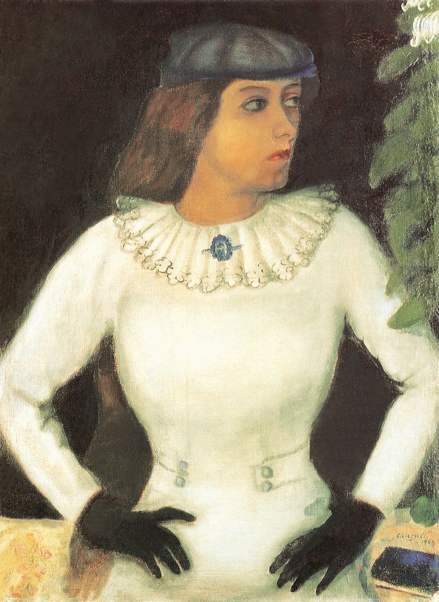 En el otoño de 1909 por medio de Thea Brachman, una amiga que había posado para él, Chagall conoció a quien sería su futura esposa, Bella Rosenfeld. Un encuentro inolvidable relatado por ambos en sus memorias: «¡De repente me di cuenta de que no era con Thea con quien debía estar sino con ella! Su silencio era el mío. Sus ojos, míos; era como si me conociera desde siempre, como si conociera toda mi infancia, mi presente, mi futuro; como si me estuviera cuidando, mirando de cerca dentro de mí, aunque la veía por primera vez. Sentí que era mi esposa[14]», relata Chagall en Mi vida. Y en Lumières allumées Bella responde: «No me atreví a levantar los ojos para encontrar la mirada del joven. Sus ojos ahora son verdes grisáceos, cielo y agua. ¿Es en estos ojos o en un río que estoy nadando…?[15]» Mi prometida con guantes negros (1909) es la evidencia de la confusión que sintieron. La obra fue la primera de una larga serie de retratos de Bella y corresponde a los retratos familiares de David, Mania y Aniuta, pero se distingue de ellos por su intenso aire de solemnidad.