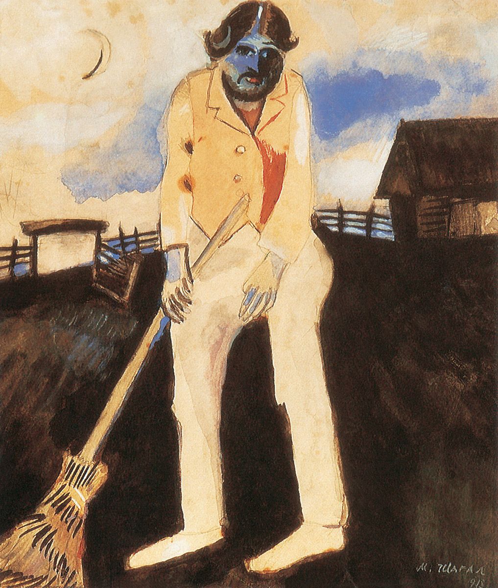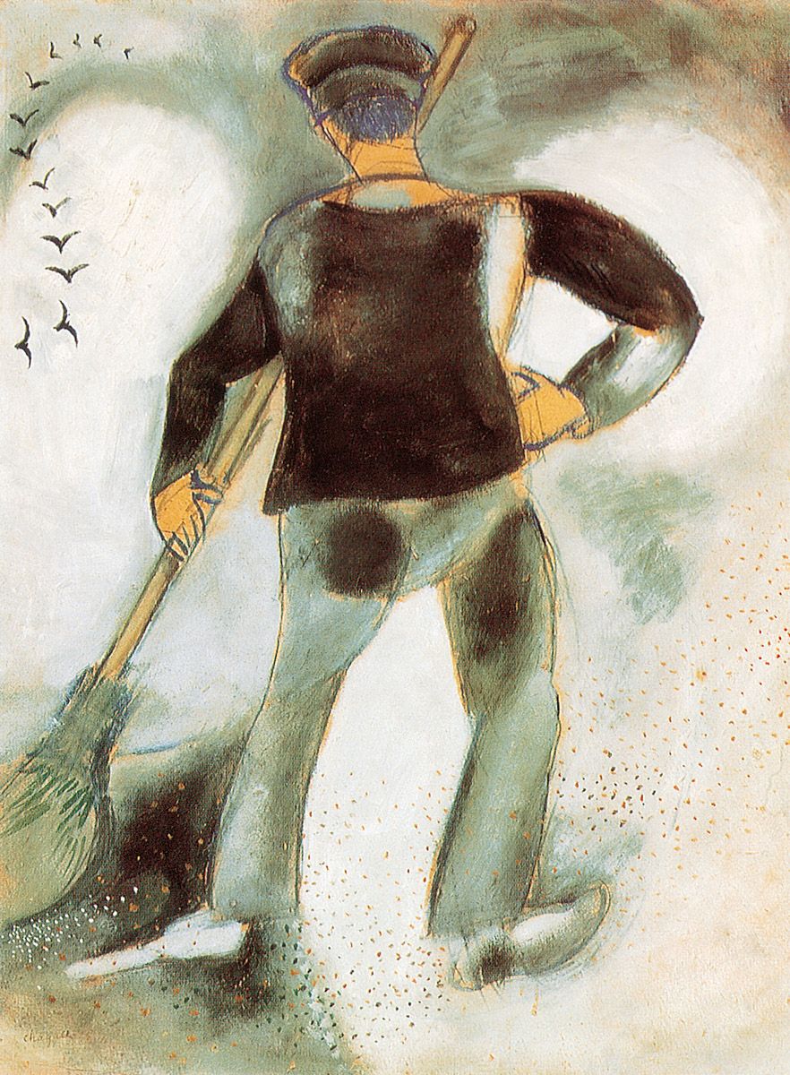 Un nuevo símbolo alegórico del destino, el barrendero se encuentra en el límite de estos dos mundos; con respecto a la figura desconocida que está de espaldas a esta escena y parece huir, ¿no podría ser la encarnación del mismo Chagall? La pintura representaría así el drama de la elección que conduce al artista, por el bien de su vocación, debe alejarse del orden natural de su familia y del medio social.