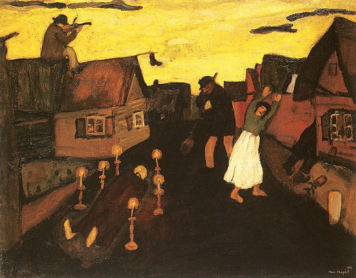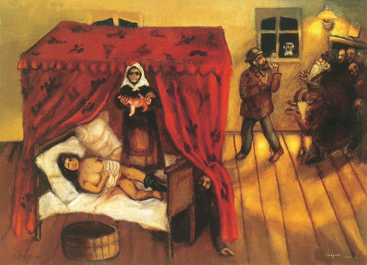 Dos pinturas son las expresiones específicas de esto: El hombre muerto (1908-1909) y El nacimiento (1910). El análisis del autor de la última obra subraya enérgicamente el carácter sacramental que transforma una escena común en una celebración litúrgica, una característica que ya era visible en El hombre muerto. Un recuerdo específico relatado por Chagall en Mi vida fue la razón para esta pintura: «Una mañana, antes del amanecer, unos gritos se elevaron de repente por la calle debajo de la ventana. Con la luz tenue de la noche, pude distinguir una mujer corriendo sola por las calles desiertas. Tenía miedo de quedarse sola con su esposo [muerto]. La gente, perturbada, corría por todos lados. Todo el mundo gemía, lloraba.