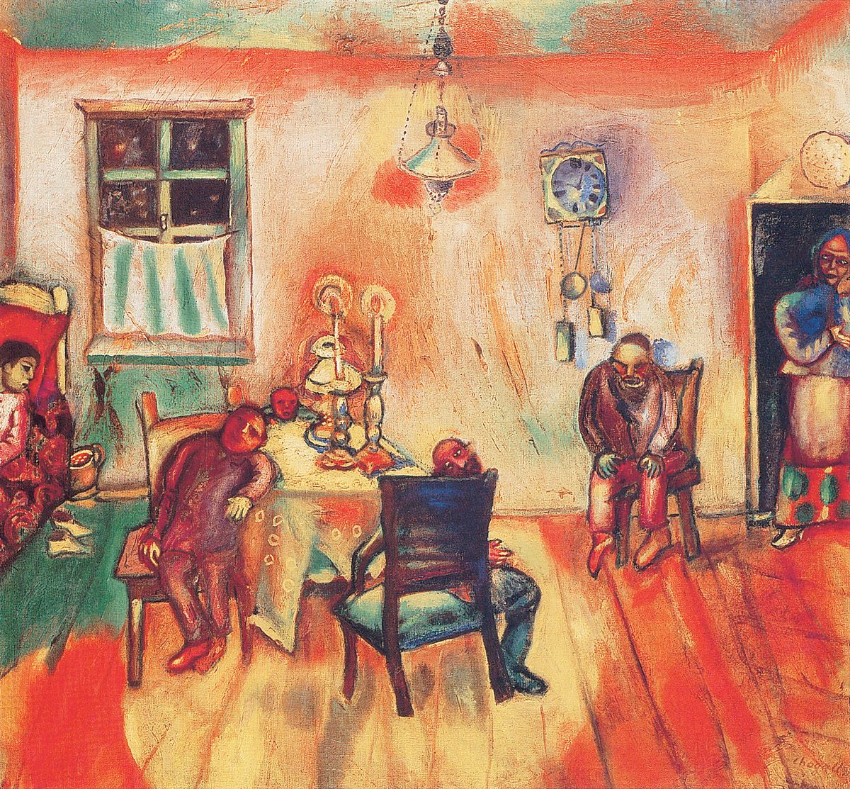 La familia Chagall pertenecía a la tradición jasídica. Debemos hacer hincapié en que esta forma de devoción, jasid significa devoto, prefiere el contacto directo entre la persona y Dios. De esta manera, el diálogo que se entabla entre el creyente y Yaveh existe sin la mediación de la pompa y exhibición del rabino. Nace directamente del ritual diario y se expresa en el ejercicio de la libertad personal. El jasidismo se extiende fuera de la erudita cultura talmúdica, el comentario institucional de la sinagoga. Históricamente se encontraba en comunidades rusas y polacas, comunidades basadas en el núcleo original fundamental de la sociedad judía que, por supuesto es la familia.