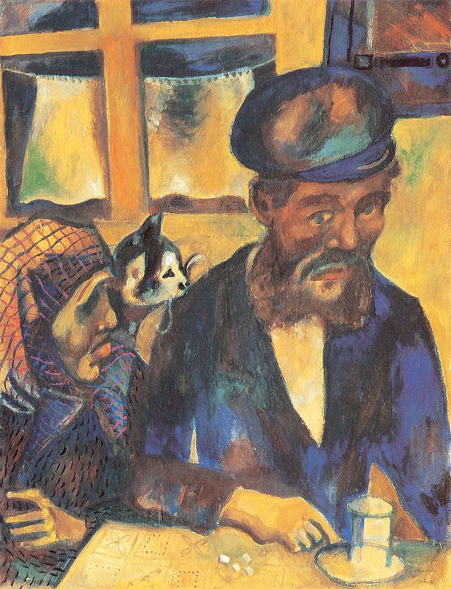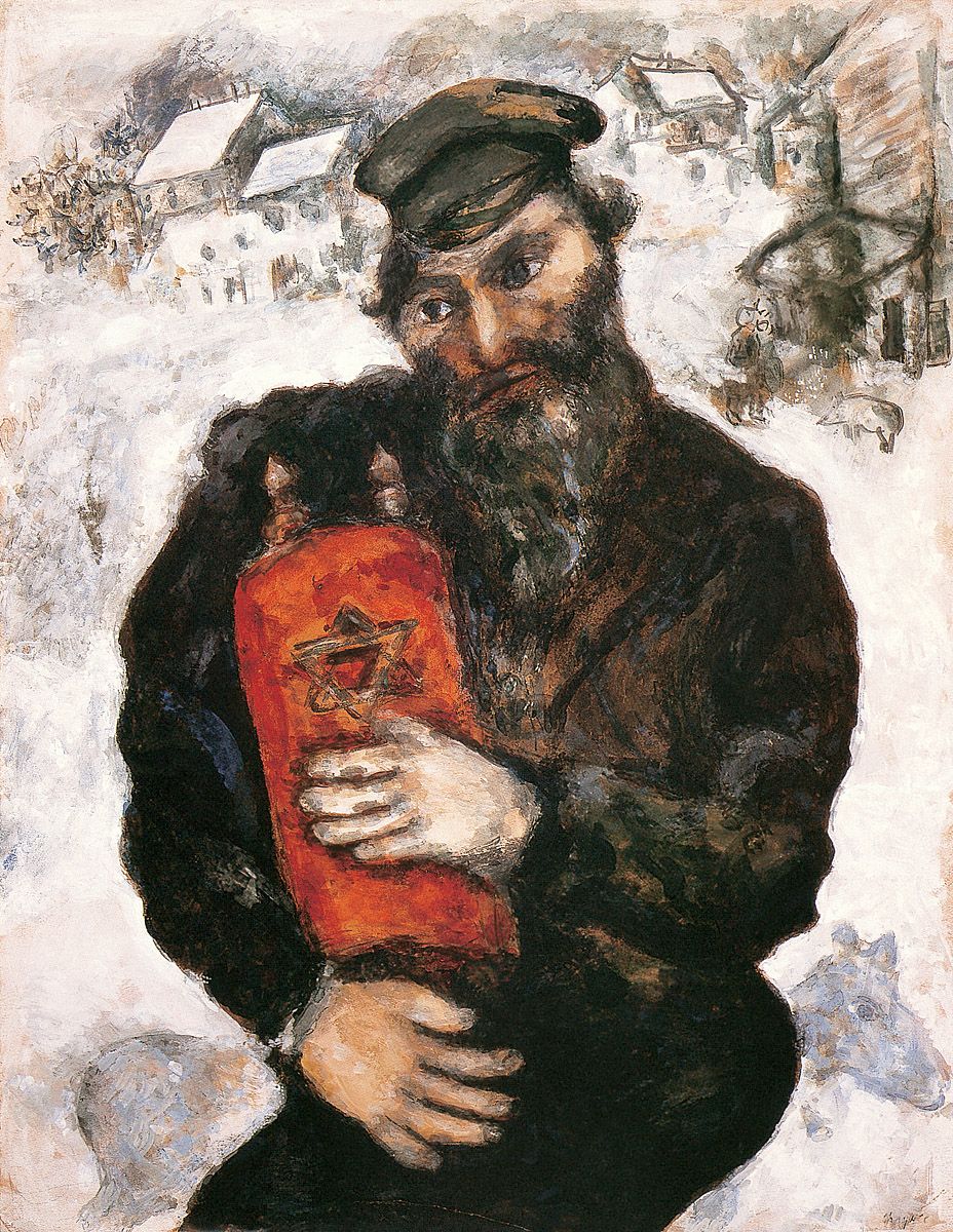 Marc Chagall nació en una estricta familia judía en la cual la prohibición que recaía sobre las representaciones de la figura humana tenía el peso de un dogma. Si uno no conoce la naturaleza de la educación tradicional judía, difícilmente puede imaginar la fuerza transgresora, la fiebre del ser que impulsó al joven Chagall cuando se lanzó a copiar un retrato del compositor Rubinstein en el periódico Niva (Campo). Esta educación se basaba en la ley histórica de la Elección Divina y cubría solamente el aspecto religioso de la vida. La transmisión al centro del hogar judío se realizaba esencialmente a través del medio oral. Cada plegaria, cada recitación de la Tora o Talmud impuesta en el creyente se realizaba en tono cantado; se llevaban a cabo lecturas de lecciones en voz alta; a la vida cotidiana se le daba ritmo mediante las veces que se repetía la práctica del ritual de las canciones y, durante el sabbath, las bendiciones solemnes. Cada hogar judío es un lugar sagrado por la liturgia de la palabra.