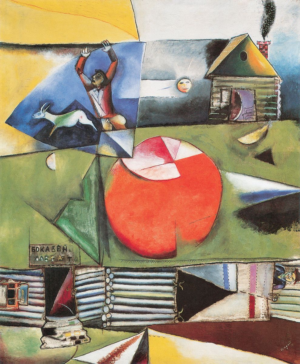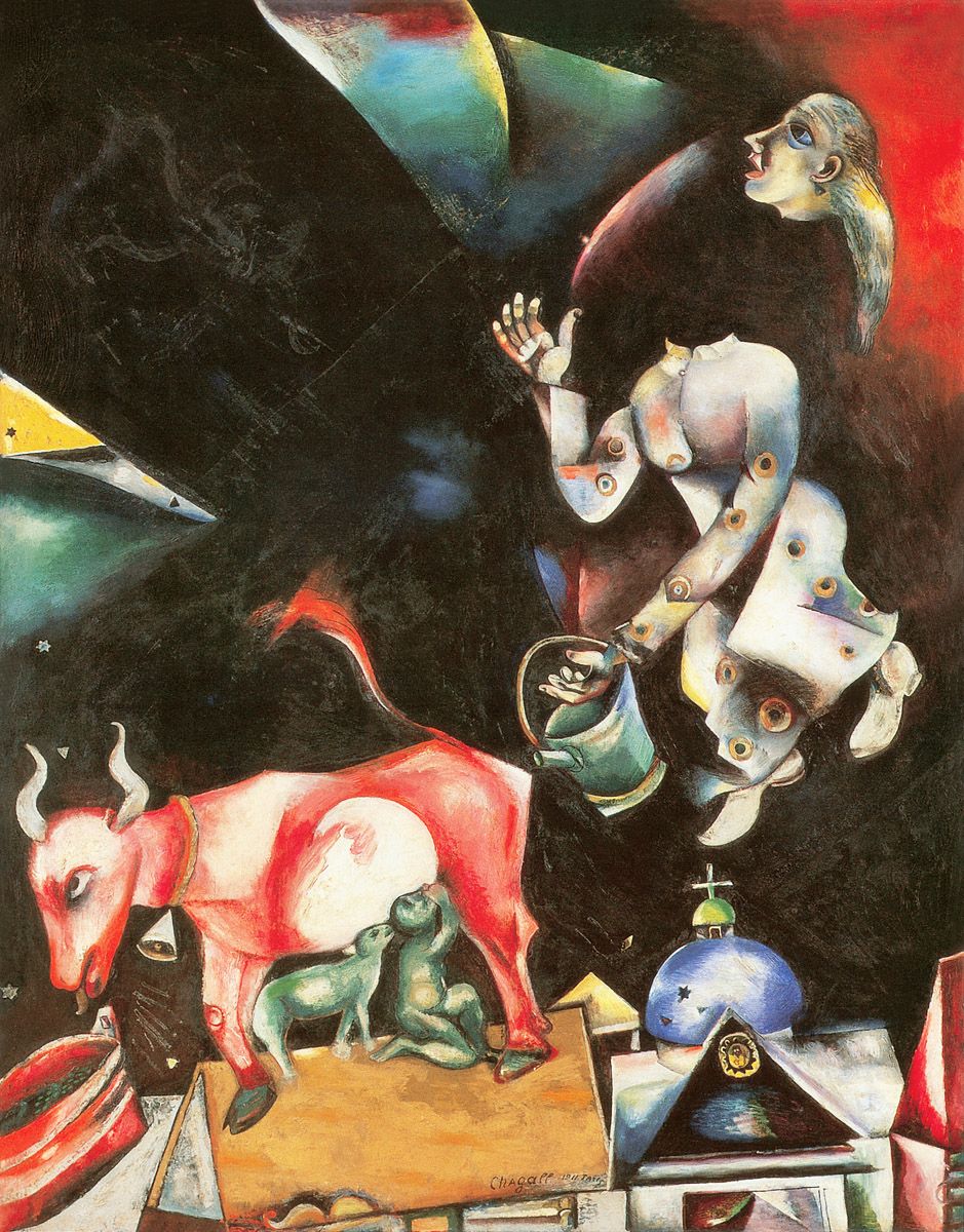 Sin duda, la sintaxis cubista le permitía al pintor darle una estructura espacial a su experiencia interna en toda su multiplicidad de niveles. Pero la «intencionalidad» de la pintura deriva de la cultura espiritualista, simbólica y peculiar de Rusia, una tierra mística par excellence. Aquí debemos mencionar la evidente similitud que existe entre la concepción del mundo de Chagall y el pensamiento simbólico ruso como se expresa en las teorías de Vladimir Solovyov o se refleja en los artículos de Viacheslav Ivanov en el diario El vellocino de oro en 1908 y en Apolo en 1910, que Jean Laude recuerda en su Naissance des abstractions[21].