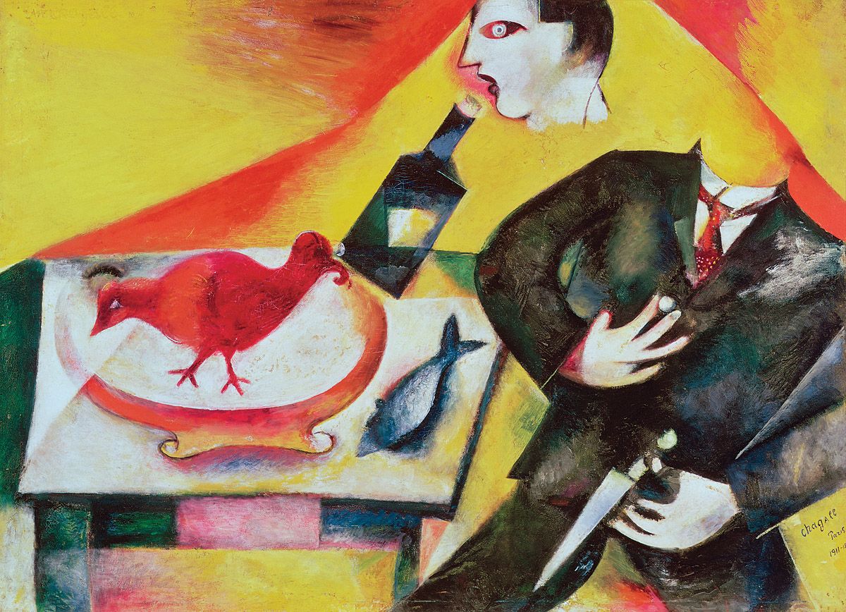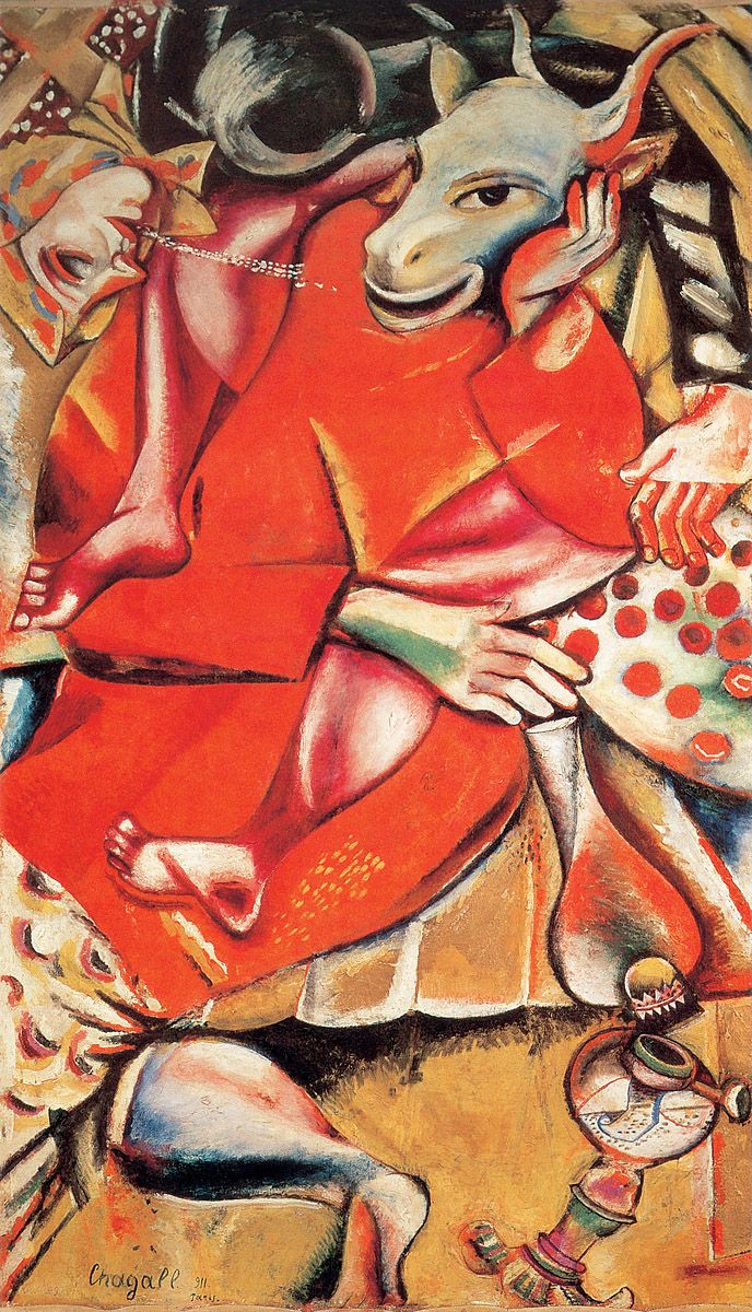Chagall ya sabía intuitivamente que el color en sus extremos es el portador de valores físicamente tangibles. Tenía que aumentar su resplandor al límite, utilizar su extraña sonoridad. El pintor estaba en deuda con los fauvistas, Van Gogh, Gauguin y Matisse, cuyos trabajos vio en la casa de Bernheim, por haber instigado su encuentro con el color absoluto. A Cézanne y a los Cubistas le debía el marco geométrico de sus pinturas entre 1911 y 1914 y los elementos de su gramática plástica. Pero su individualidad resistió todos los límites teóricos. «¡Déjenlos comer sus peras cuadradas sobre sus mesas triangulares![20]» gritó vehemente, a propósito de los Cubistas.