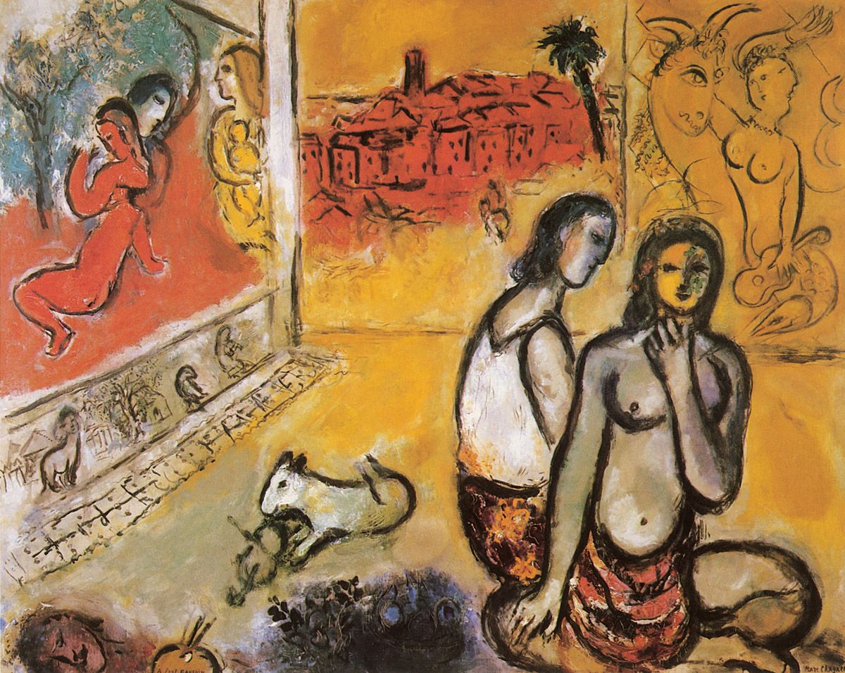 La mayor inspiración, las intuiciones más perceptivas se nutren con las palabras de poetas y filósofos. Palabras como las de Cendrars, Apollinaire, Aragon, Malraux, Maritain o Bachelard… Palabras que indican claramente las dificultades inherentes a todos los intentos del discurso crítico, como Aragon mismo subrayó en 1945: «Todo medio de expresión tiene sus límites, sus virtudes, sus defectos. Nada es más arbitrario que intentar sustituir la palabra escrita por el dibujo, por la pintura. Ésa es la llamada Crítica del arte y no puedo ser culpable de eso y tener la conciencia tranquila[8]». Palabras que revelan fundamentalmente la naturaleza poética del arte mismo de Chagall.