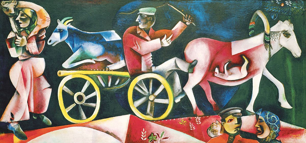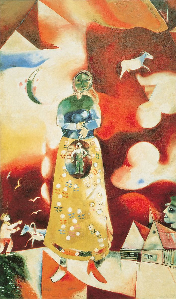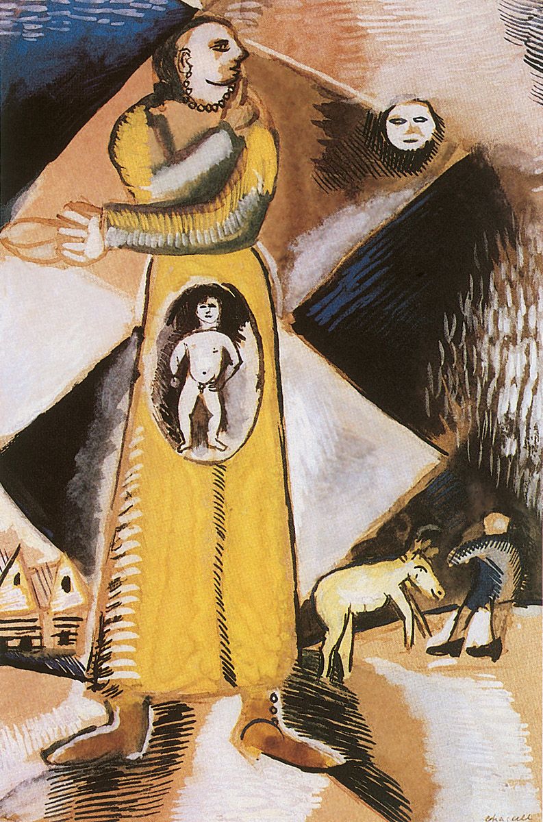 Chagall fue un verdadero creador que tomó prestado del Cubismo solamente lo que le servía a su visión personal. La pintura para este rebelde artístico era, por sobre todo, un vuelo de la imaginación. El repertorio temático de las obras ejecutadas entre 1911 y 1914 es importante en este sentido. Temas rusos mezclados con los del ghetto, figuras familiares con las de la comunidad de la aldea: La boda (1911-1912), Sabbat (1910), Abuelo (1910), Alrededor de la lámpara (1910), Nacimiento de un niño (1911), un tema ya tratado en 1910, La aldea bajo la luna (1911), Dedicado a mi prometida (1911), Judío rezando (1912-1913), El vendedor de ganado (1912), Maternidad (o la Mujer embarazada; 1913), A Rusia, a los asnos y a los otros (1911), El padre (1914), todos hablan de su tristeza, de una nostalgia por la tierra de su nacimiento.