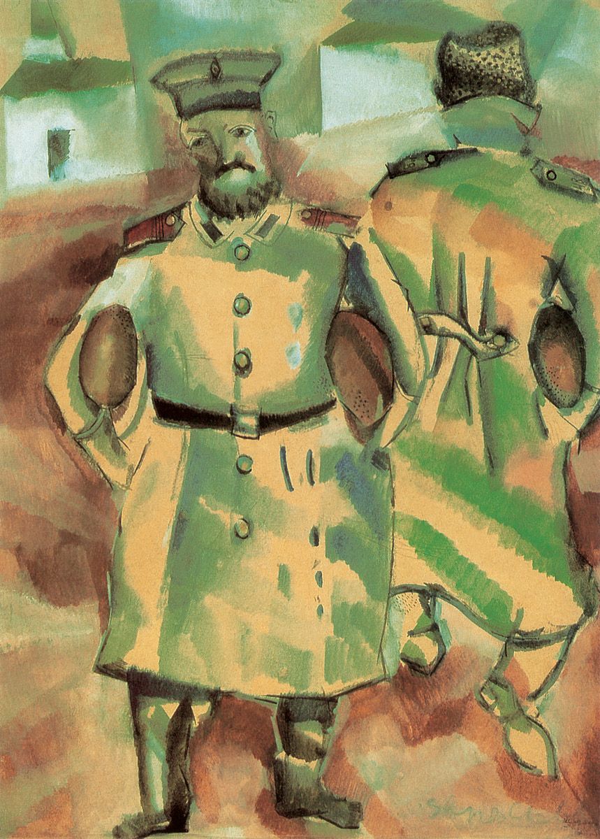 Soldados con panes, 1914-1915. Gouache y acuarela sobre cartón, 50,5 x 37,5 cm. Colección M.Z. Gordeïeva. San Petersburgo.