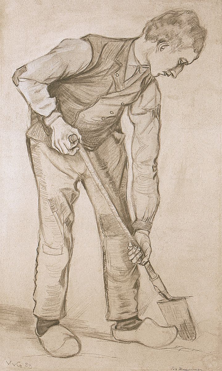 9. Campesino cavando, Etten, septiembre de 1881. Tiza negra, aguada, pluma y tinta diluida, acuarela opaca y huellas de carboncillo en papel verjurado, 44 x 34 cm. Museo Kröller-Müller, Otterlo.