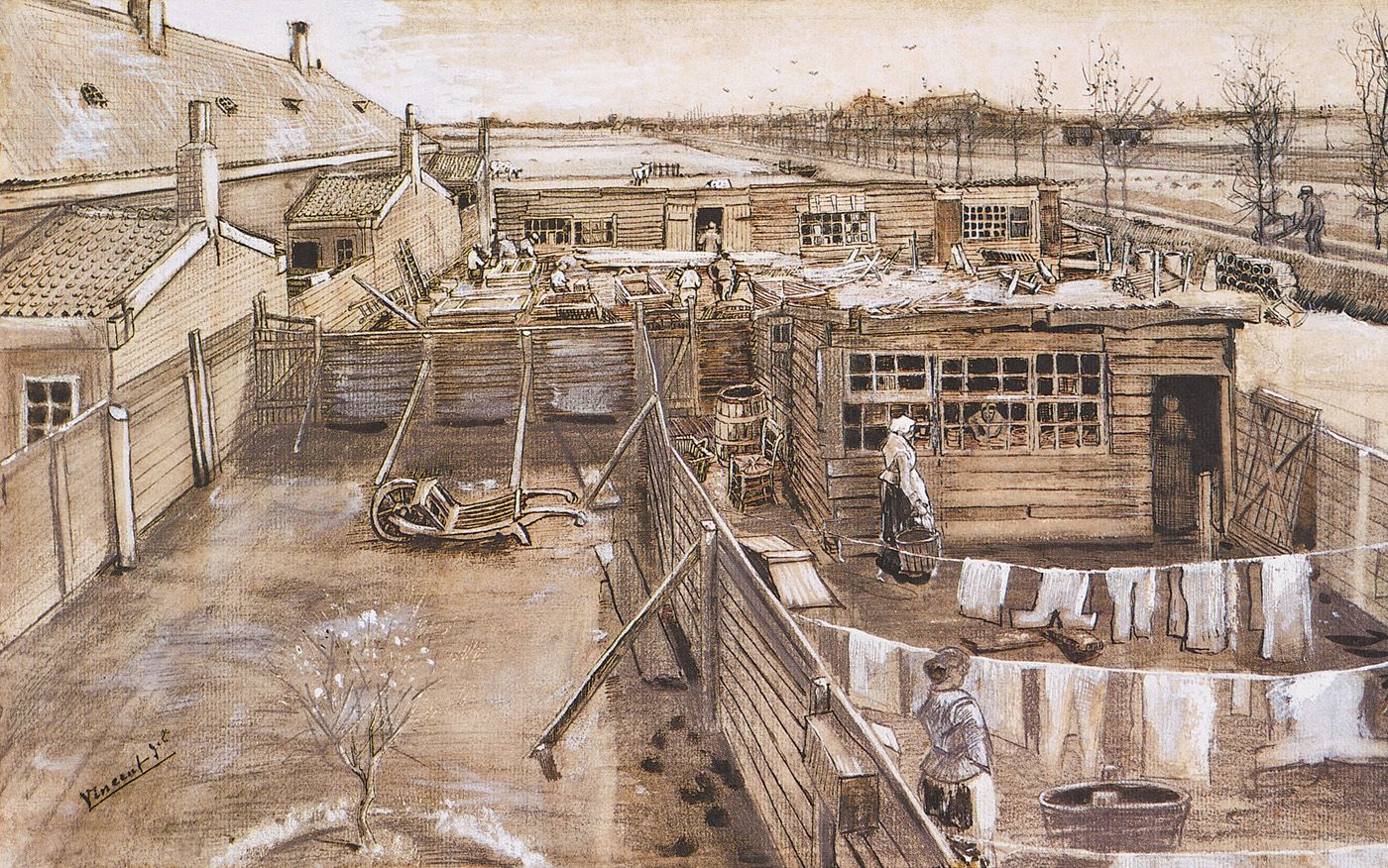 43. Patio y lavadero de un carpintero, La Haya, mayo de 1882. Lápiz, pluma y pincel en tinta negra, aguada gris, acuarela blanca opaca y huellas de cuadrícula en papel verjurado, 28,5 x 47 cm. Museo Kröller-Müller, Otterlo.