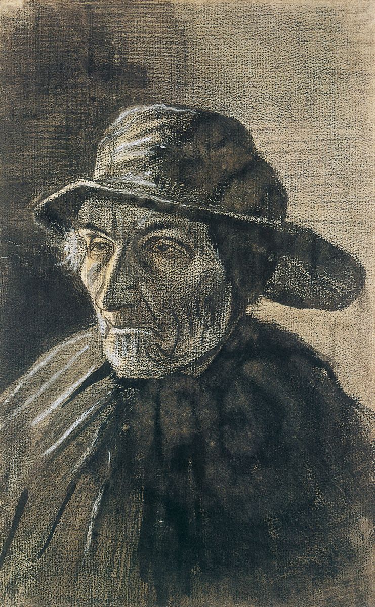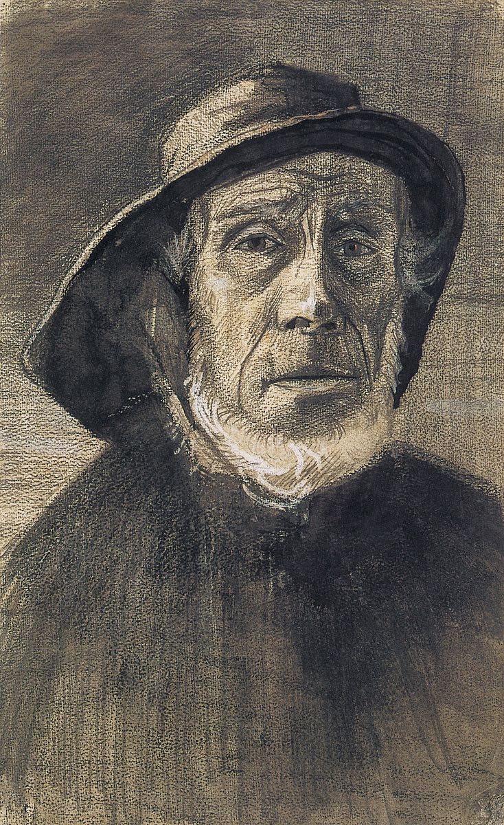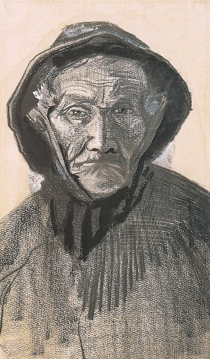 46. Cabeza de pescador con sueste, La Haya, enero de 1883. Lápiz de dibujo, lápiz litográfico negro, tiza blanca, pincel con tinta negra, acuarela, aguada gris raspada sobre papel de acuarela, 50,5 x 31,6 cm. Museo Van Gogh, Ámsterdam.