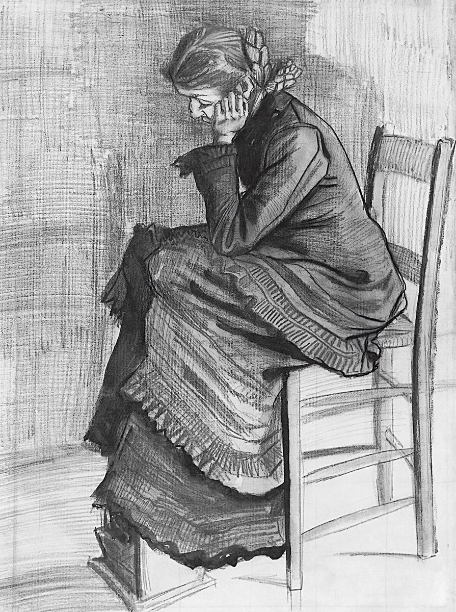 53. Mujer sentada, La Haya, comienzos de mayo de 1882. Lápiz, pluma y pincel con tinta (diluida), aguada, huellas de cuadrícula, sobre papel verjurado (dos hojas), 58 x 43 cm. Museo Kröller-Müller, Otterlo.