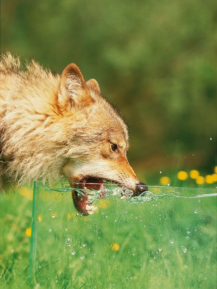 El lobo bebe con la lengua curvada hacia el frente