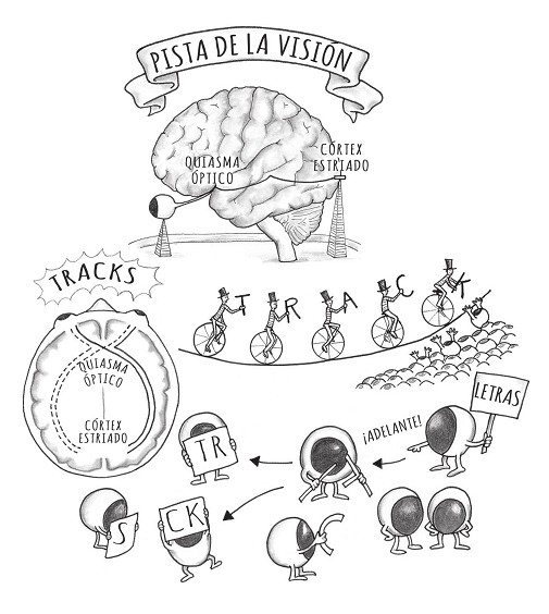 Tras su llegada a la cuarta capa de esta región cortical, los ciclistas se despliegan (véase figura 2). De repente, la totalidad de la pista de la visión en los lóbulos occipitales es un torbellino de actividad. La información procedente de los acróbatas que pedaleaban sobre el cable se transfiere rápidamente a grupos de diminutas criaturas esféricas con aspecto de orbes que recuerdan vagamente a... digamos, pequeños ojos con brazos y pies. Un grupo de estos laboriosos orbes identifica el mensaje de los ciclistas como un conjunto de «letras» y transfiere de inmediato esa información a otras criaturas esféricas vecinas, emplazadas en regiones más profundas del córtex, que se encargan de indicar que se trata de letras reales y válidas. Acto seguido, un nuevo grupo examina los trazos que conforman las letras (por ejemplo, las líneas, los círculos y las diagonales) y los identifica como las conocidas t+r+a+c+k+s (‘pistas’) de las letras del idioma inglés. Según parece, casi inmediatamente después de que el segundo grupo efectúe el reconocimiento de las letras de una palabra, otros equipos de neuronas especializadas en múltiples tareas entran en acción. Algunos orbes sólo actúan sobre letras individuales, mientras que otros responden a los patrones de las letras que componen las palabras, patrones tales como el ack y el tr de tracks; otros, en cambio, identifican las partes significantes más usadas de las palabras denominadas morfemas (prefijos y sufijos como la s que marca el plural de nuestra palabra). Salta a la vista que cada grupo de trabajo en esta pista tiene su propio dominio territorial y trabaja rápida y diligentemente sólo en esos bits específicos de información visual. No podemos dejar de advertir que una serie de grupos de orbes aparecen plácidamente desinteresados o, cuando menos, desocupados o con poca actividad al ver nuestra palabra. Algunos se encargan únicamente de identificar palabras completas y más frecuentes como stop y the (artículo definido), términos comunes que a menudo reciben la denominación de palabras visuales debido a que no necesitan de un análisis posterior por parte de otras neuronas visuales. Otros, como era de esperar, se dedican a otros menesteres relacionados con la visión.