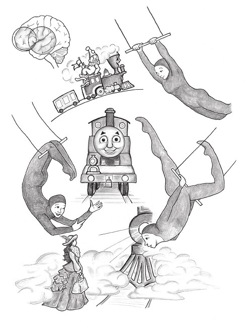 Si nosotros, como sociedad, tenemos que lidiar con las implicaciones de los continuos cambios en nuestro cerebro de lectura plástico, debemos situarnos «bajo la caperuza» del circuito de lectura. O, tal vez, con una mínima suspensión de la incredulidad de tu parte, bajo la carpa. Para dar vida a las múltiples operaciones que simultáneamente acontecen en el cerebro lector cada vez que leemos una palabra, no se me ocurre mejor metáfora visual que un circo de tres pistas. Pero no un circo de tres pistas cualquiera sino uno lleno de artistas y criaturas fantásticas que sólo resultan concebibles en una carpa del Cirque du Soleil, donde la magia triunfa sobre la credulidad. Con la ayuda de la neurocientífica y talentosa artista Catherine Stoodley, eso es precisamente lo que quiero que experimentes.