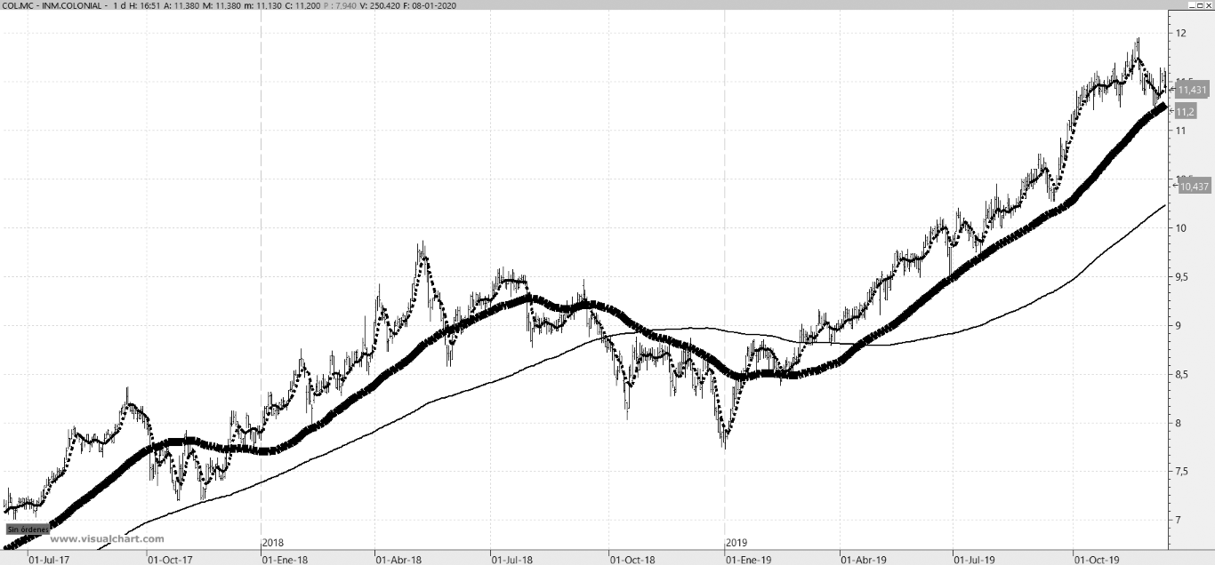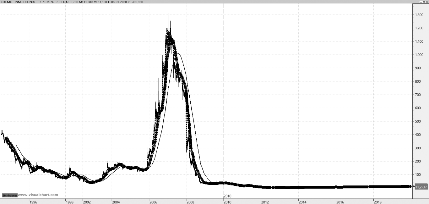 Este gráfico pertenece a Colonial, una gran empresa del sector inmobiliario. Quizá al ver este gráfico pienses «vaya, lleva unos meses subiendo» y, sí, es verdad que desde 2017 ha estado subiendo, pero ampliemos un poco la temporalidad del valor y verás cómo cambia la historia: