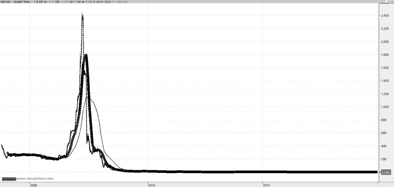 Otro caso aún más extremo es el que puedes ver a continuación: se trata de Quabit, una inmobiliaria, donde la acción pasó de 2.400 € a 0,82 €.